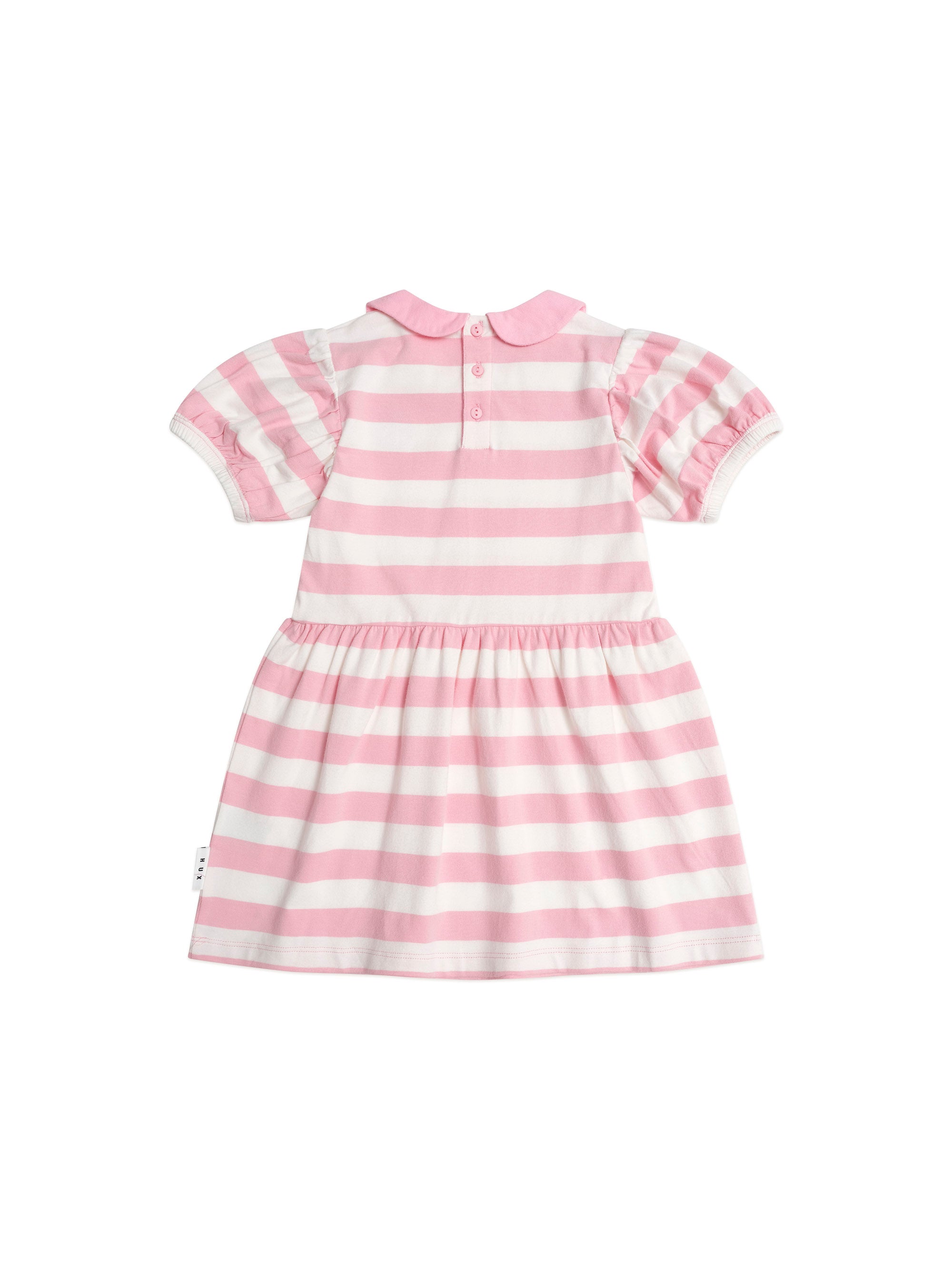 The perfect everyday dress from Huxbaby's summer range. Made from soft organic cotton jersey, this pretty pink striped number features sweet puff sleeves, a peter pan collar and an embroidered chest strawberry. Features buttons down back for easy dressing. Play the day away!