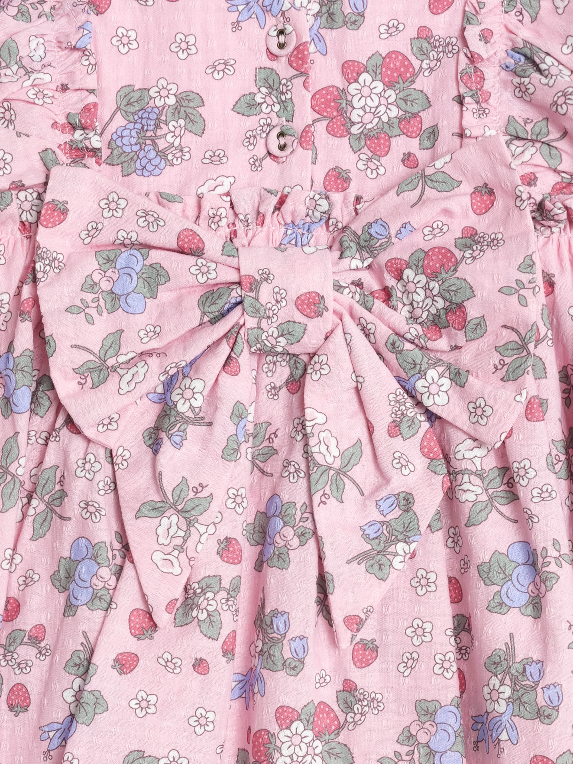 Spring has arrived in the prettiest Strawberry Garden Sunday Best Dress from Huxbaby. Made from 100% organic cotton, it features shoulder ruffles, fabric buttons, and an oversized bow at the back.