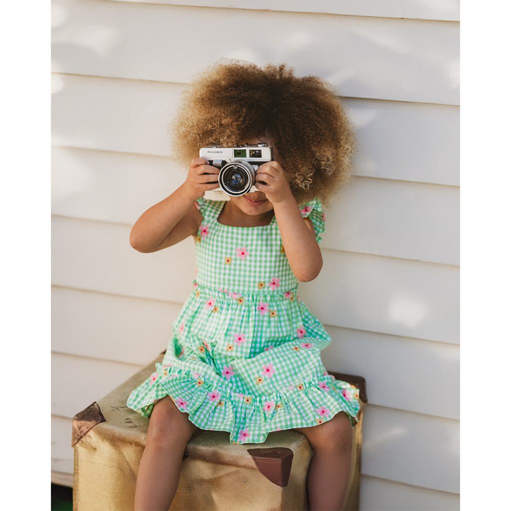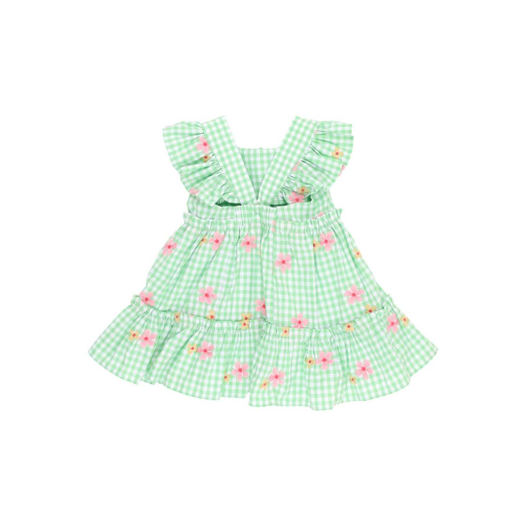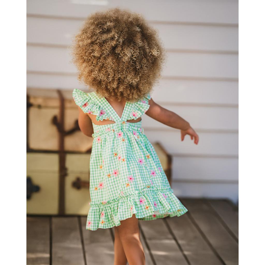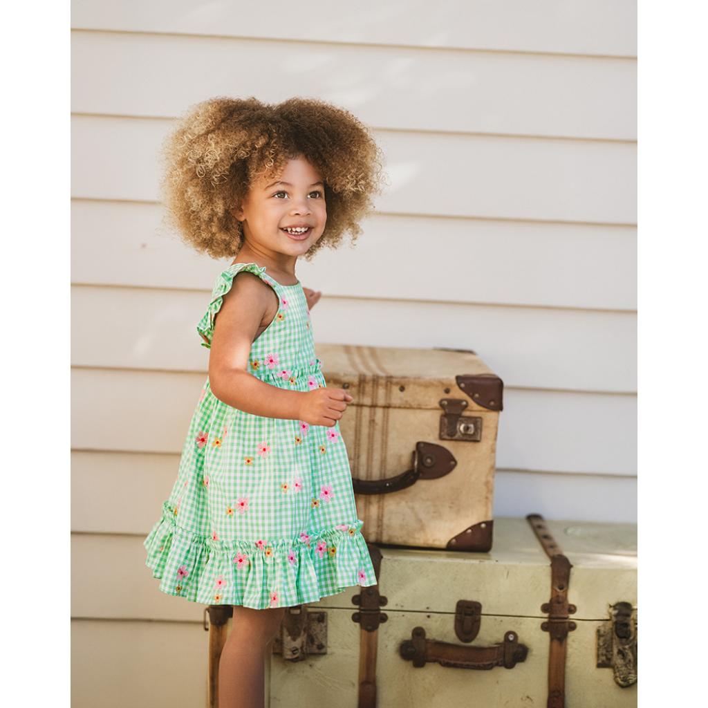 A fresh take on gingham for your littlest flower, from Fox & Finch's summer range. This sweet green check tiered dress is scattered with delicate embroidered blooms, and finished with fluttery shoulder frills for extra charm. Fully lined for comfort, it's perfect for special outings or sunny-day play.