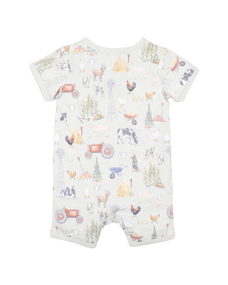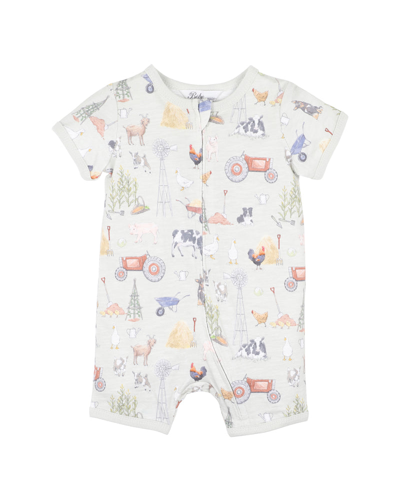 This short sleeve short leg romper from Bebe's summer range features a gorgeous farm animal print. With a front zip for ease of dressing your little one.