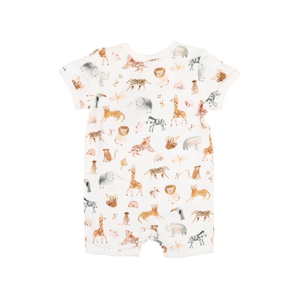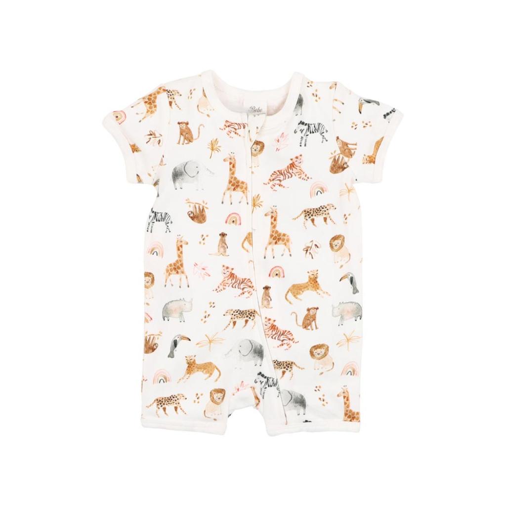 Take a walk on the wild side with this organic cotton short sleeved zipsuit from Bebe, in an enchanting safari animal print. Crafted from soft, breathable organic cotton jersey, this romper is as comfy as it is playful—perfect for everyday adventures. The whimsical safari-inspired print brings lions, giraffes, zebras and more to life in a palette of warm desert tones. With an easy zip front opening for fuss-free changes, getting dressed is a breeze.