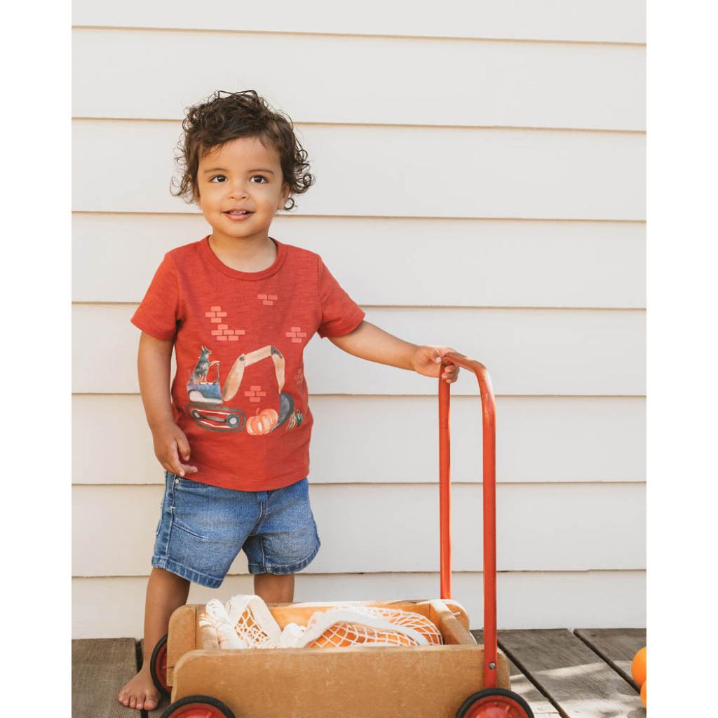 For little ones who love big machines, this bold red tee from Bebe's summer range is sure to become a favourite. Featuring a fun digger print with a hardworking pup at the wheel and pumpkins ready for harvest, it’s packed with charm and farmyard flair. Soft cotton jersey keeps things comfy all day long, whether they’re off to play or exploring the backyard.
