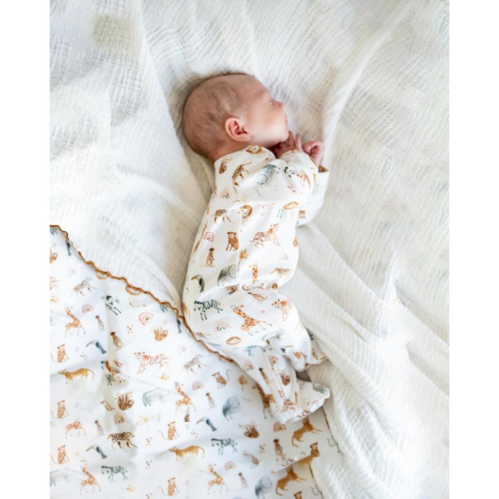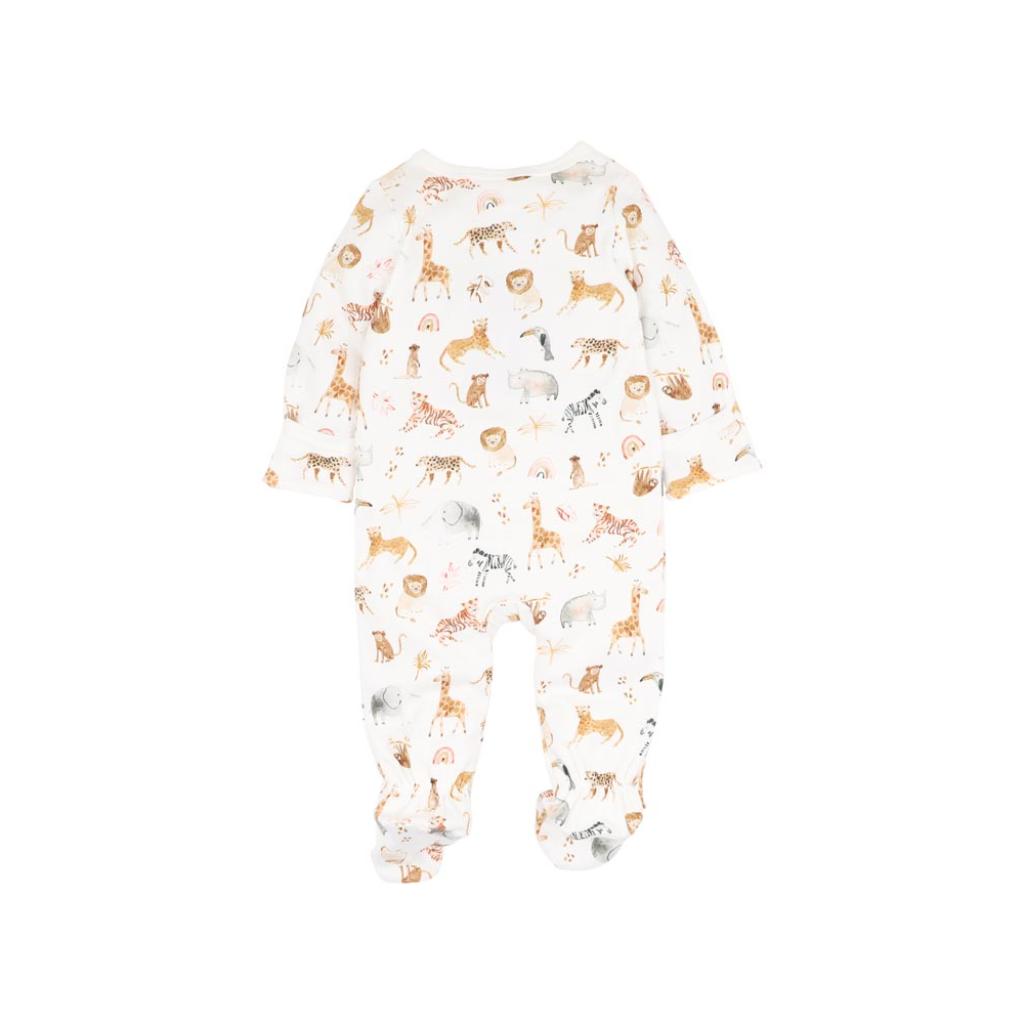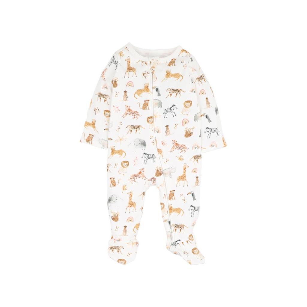 Take a walk on the wild side with this organic cotton long sleeved zipsuit from Bebe. Featuring a whimsical hand-drawn safari animal print in gentle earthy tones, this zipsuit offers comfort and cuteness in equal measure. The full-length zip makes changes a breeze, while enclosed feet and fold-over mittens keep little explorers cosy and secure.