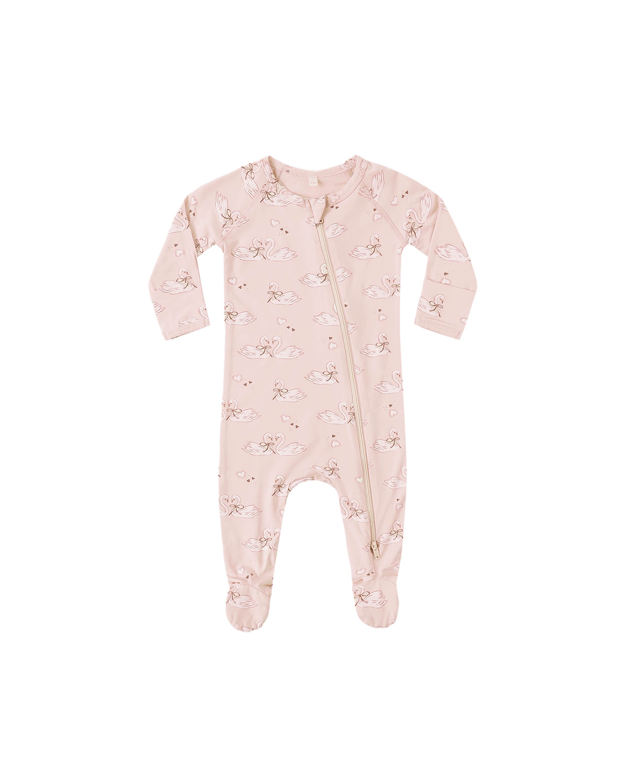 Full double-zip footed onepiece from Quincy Mae, crafted from soft and stretchy bamboo fabric. Fold-over hand mitts included on sizes NB – 3-6M.