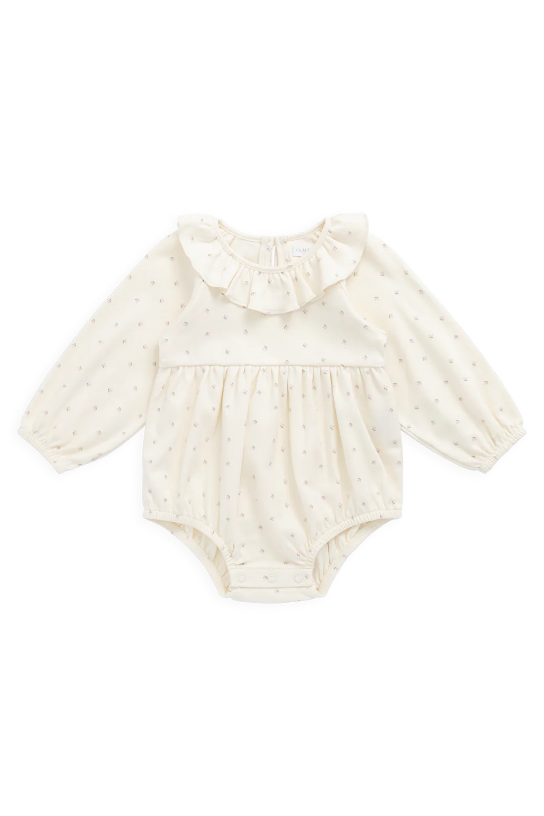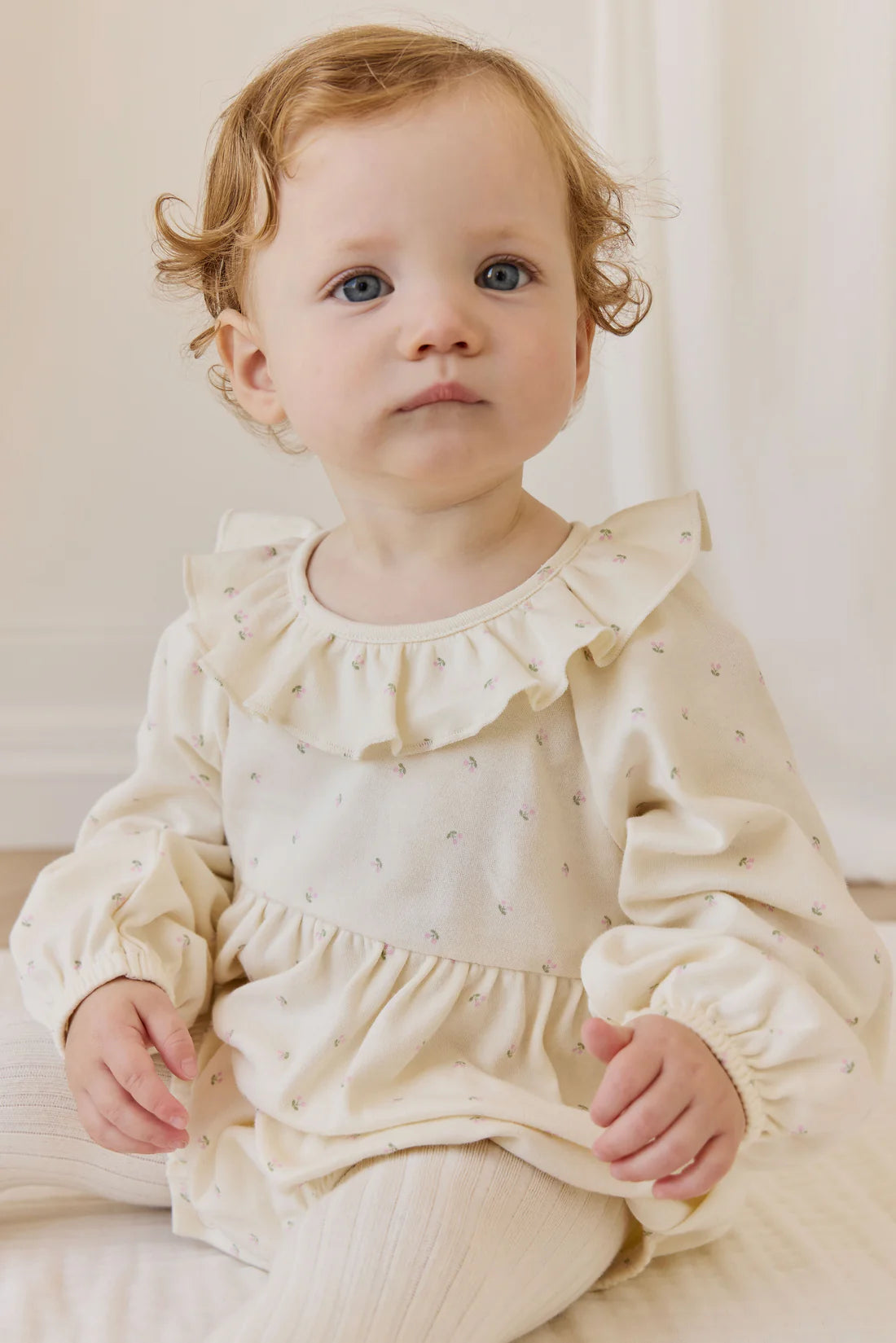 Crafted from 100% organic cotton, it’s naturally breathable and gentle on delicate skin. The long sleeves offer additional warmth, and the frill at the collar adds a vintage charm.