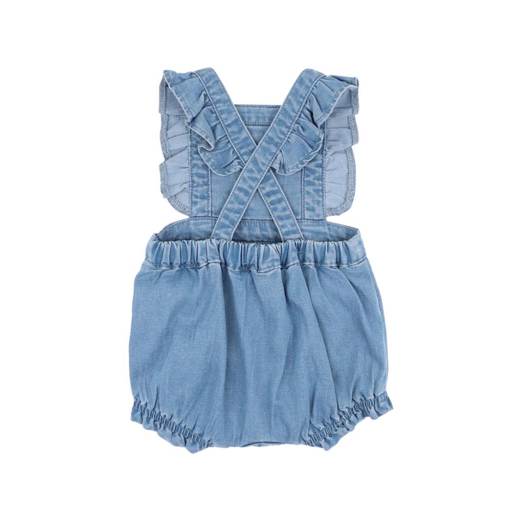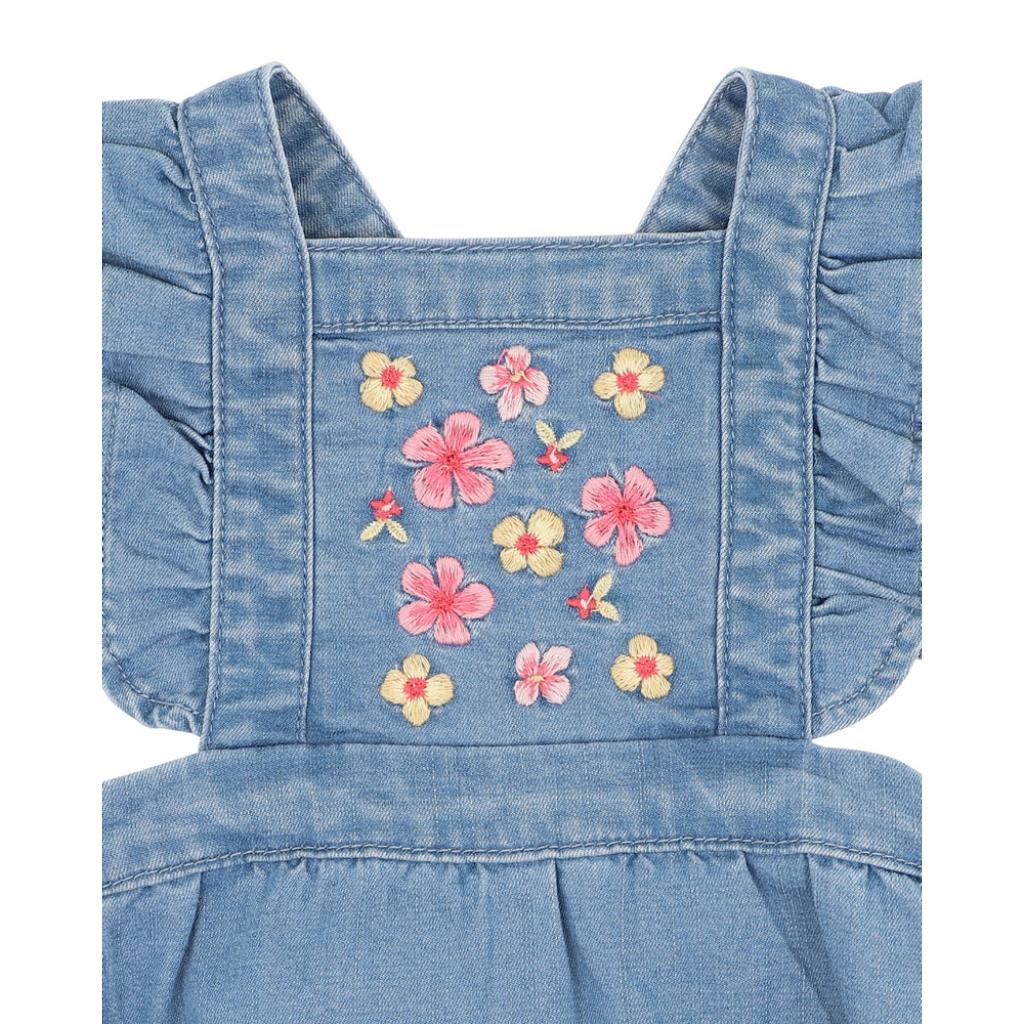 This gorgeous Fox & Finch romper brings a little touch of vintage charm for your wee one. It features a soft denim look, sweet floral embroidery on the chest, and fluttery frilled straps that cross over at the back for a playful, nostalgic look. The gently gathered leg openings and comfortable stretch waistband ensure a snug and flexible fit for all-day adventures.
