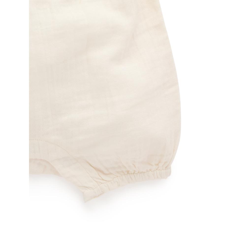 This sweet embroidered romper is the perfect outfit for those special occasions. Featuring a pretty floral crochet and embroidery at the yoke and flutter sleeves with lace detailing. Designed as a balloon style, with gathers around the legs for a comfortable fit. Made from the softest 100% organic cotton muslin for a lightweight style.