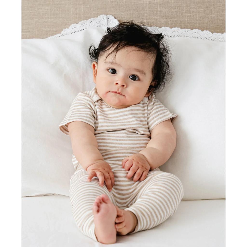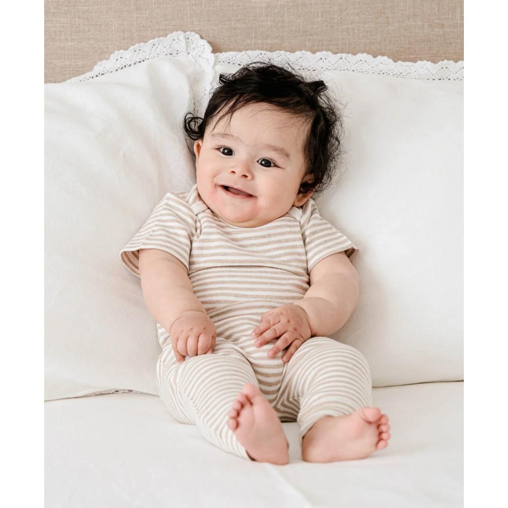Comfy and practical short sleeve bodysuit from Lummi in Colour, featuring a neutral oat stipe colourway.