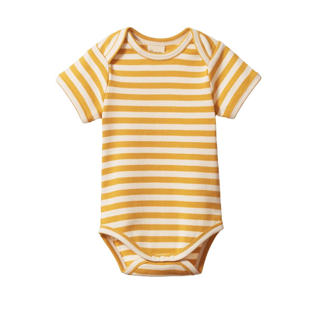 Short sleeve organic cotton bodysuit from Nature Baby in golden sea stripe. So cute on its own or great as a layering piece. Plunket style neckline for ease of getting over baby's head and domes at the crotch for nappy changing.