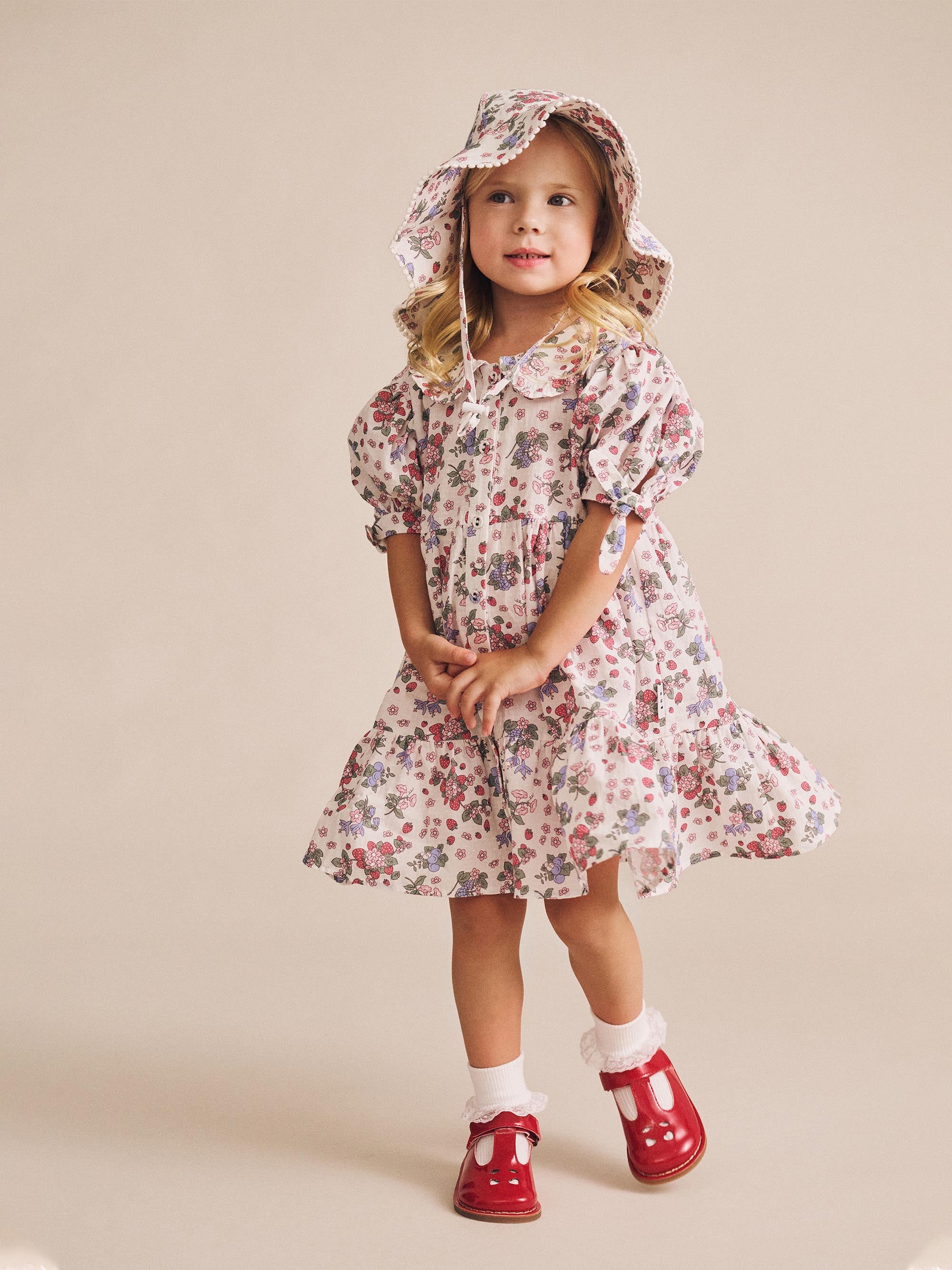 This gorgeous Strawberry Garden Tiered Smock Dress from Huxbaby is a summer showstopper! Made from 100% organic cotton, it features a peter pan style frilly collar, fabric buttons, a full, tiered skirt and exaggerated puff sleeves.