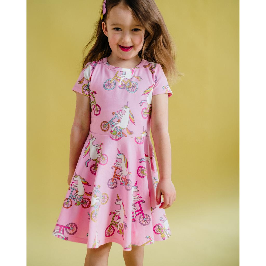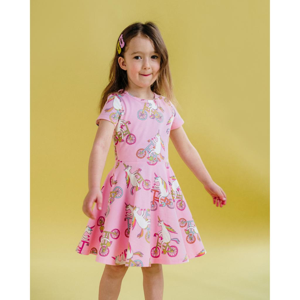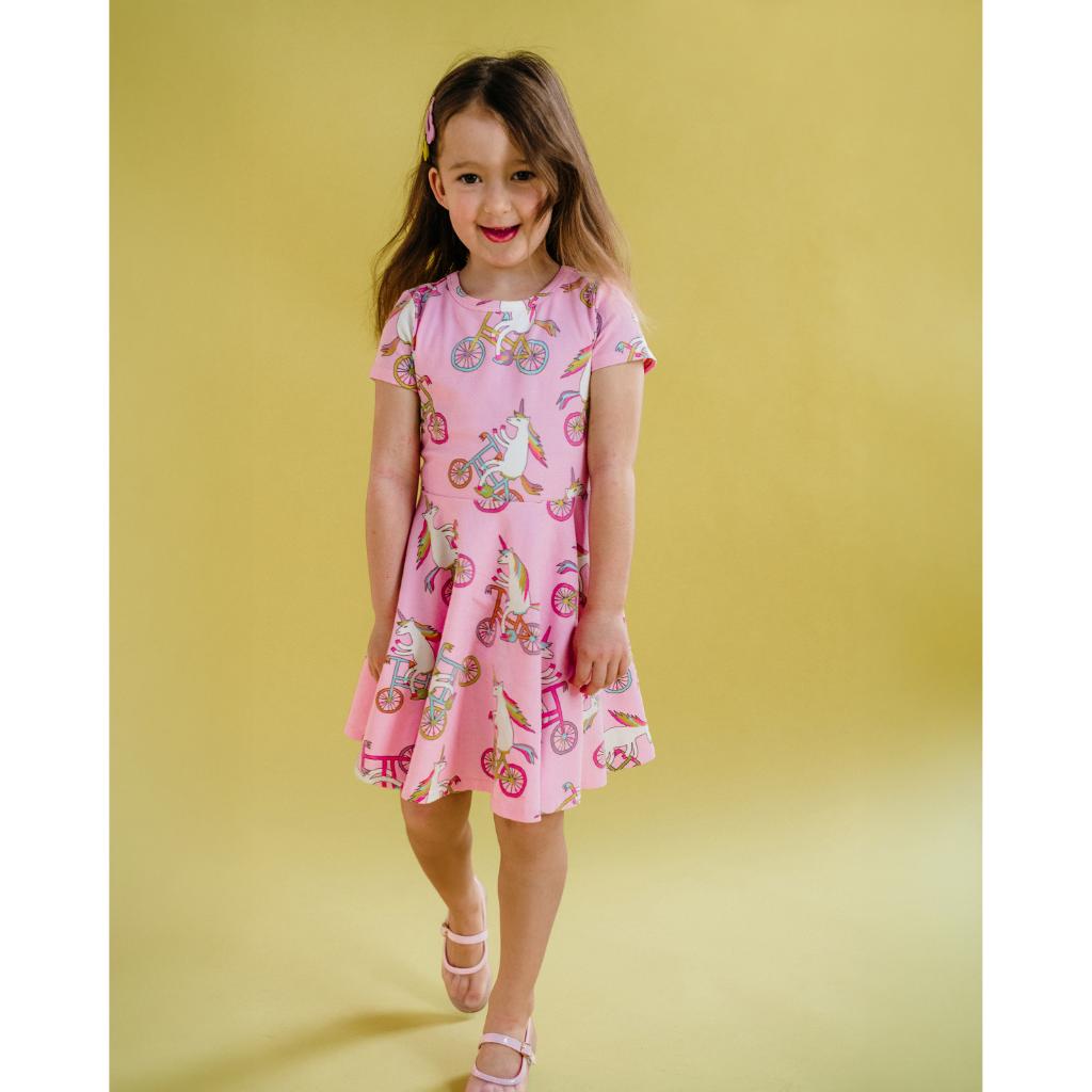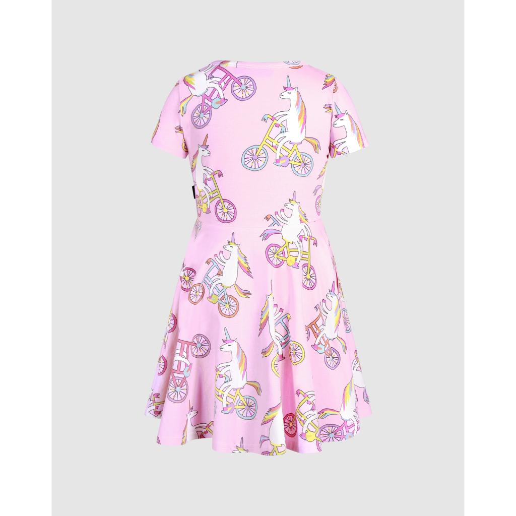 Bring magical moments to everyday play with the Unicorn Bike Waisted Dress from Rock Your Kid's summer range. Crafted from soft cotton-elastane jersey, this fit-and-flare dress features a cheerful all-over unicorn bike print on a pink base, and short sleeves for everyday comfort. Perfect for parties, playdates, or sunny days out.