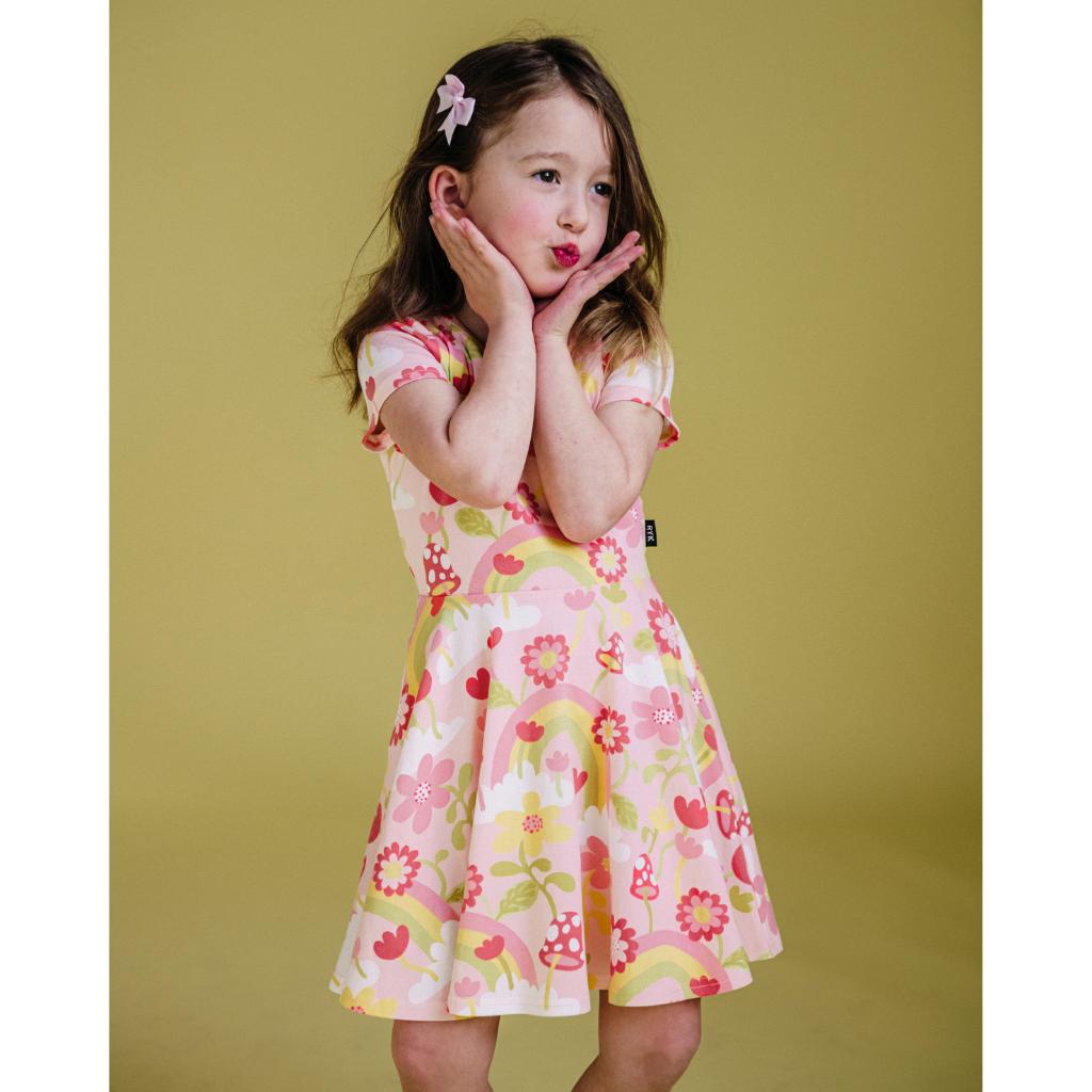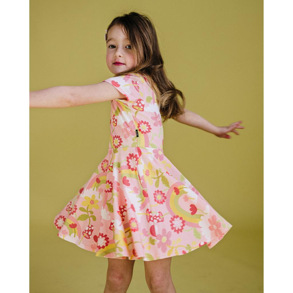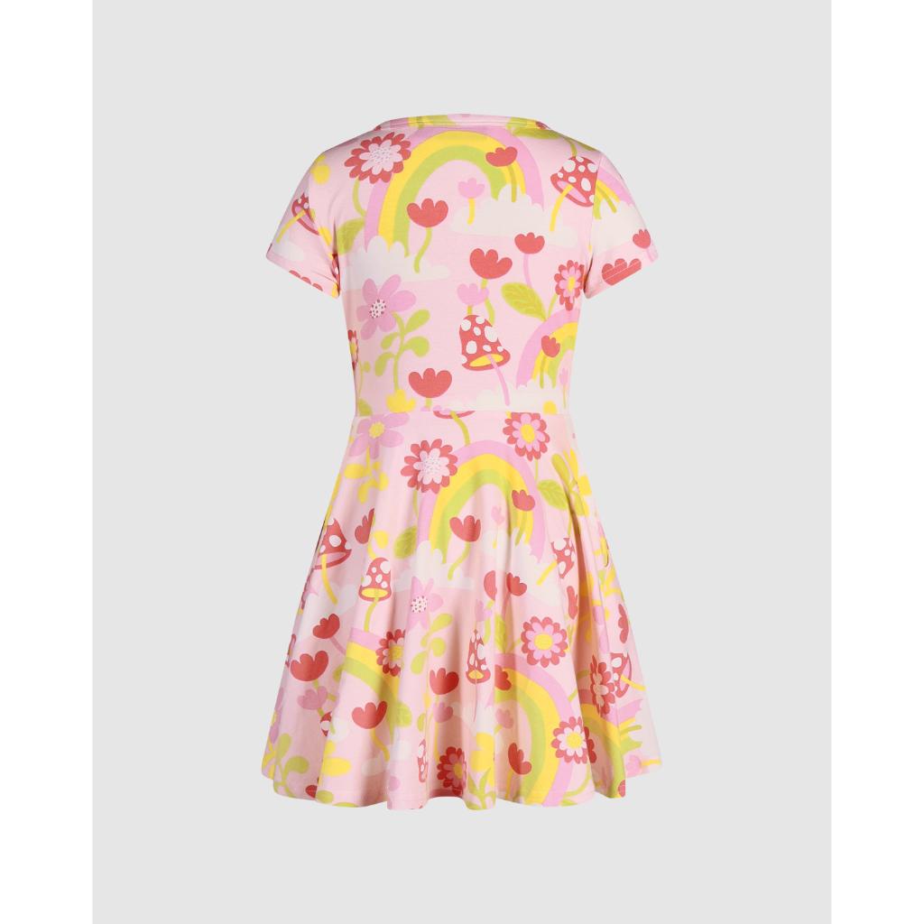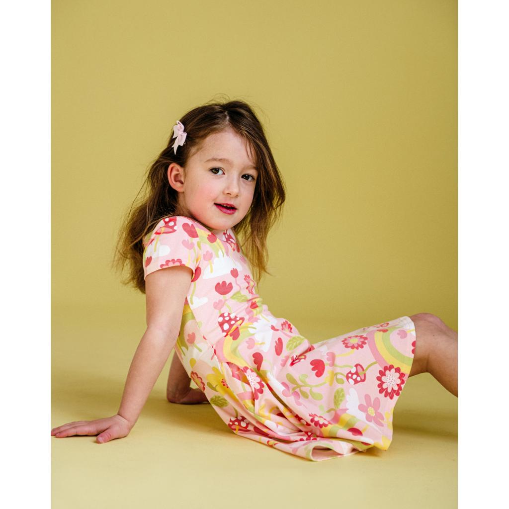 The Mushroom World Waisted Dress from Rock Your Kid is a playful addition to any little one's wardrobe. Made from soft cotton-elastane jersey, this short-sleeve fit-and-flare dress features a coral base with an all-over mushroom world print. Perfect for playdates, parties, or everyday fun, it brings a cheerful and whimsical vibe to any outfit.