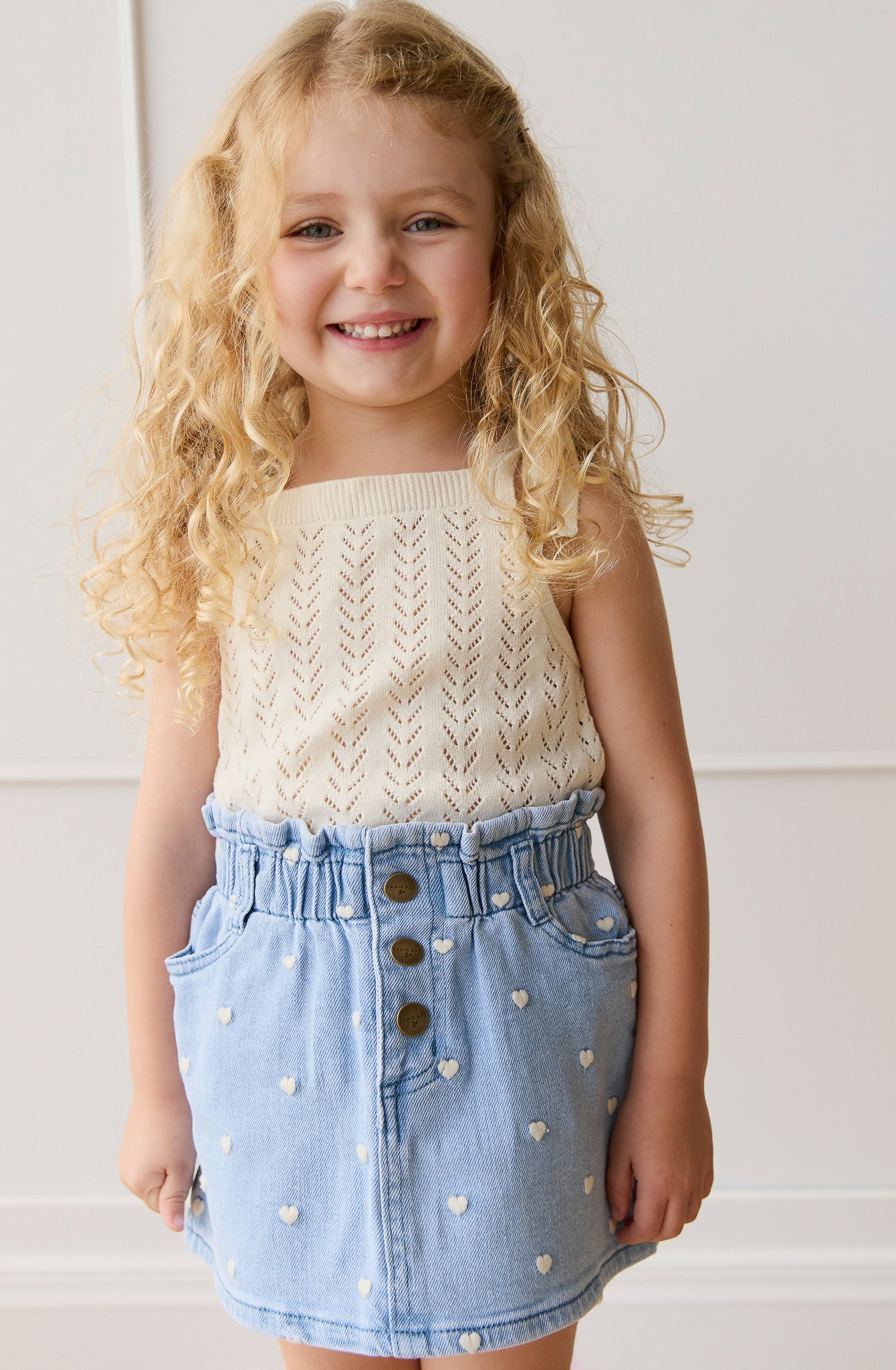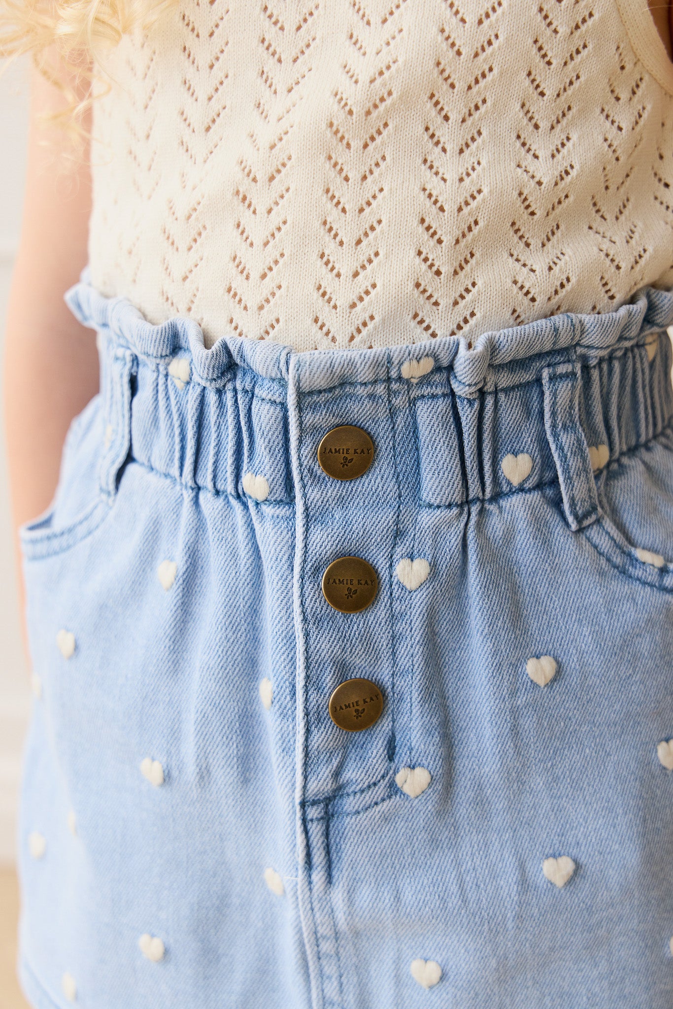 The sweetest little denim skirt from the Jamie Kay Briella collection. The Briella Skirt features an elasticated waist, three metal buttons at the front, and front pockets. It also has a cute allover heart embroidery on a washed denim base.