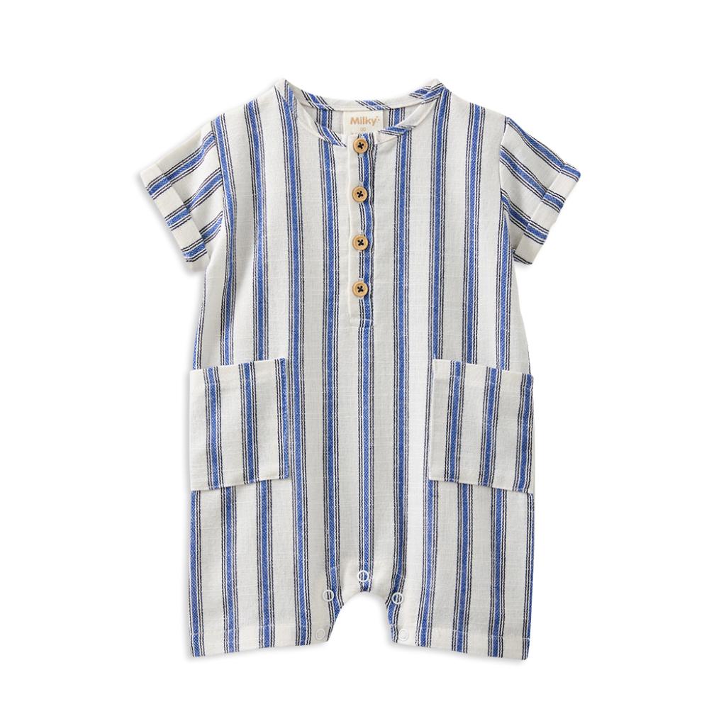 This delightful summer romper from Milky's baby range is crafted from breathable cotton blend fabric, perfect for warm weather adventures. Designed to suit both boys and girls, this classic piece features convenient snaps at the crotch and buttons at the center front, ensuring effortless changes. This romper is going to receive compliments with each wear!