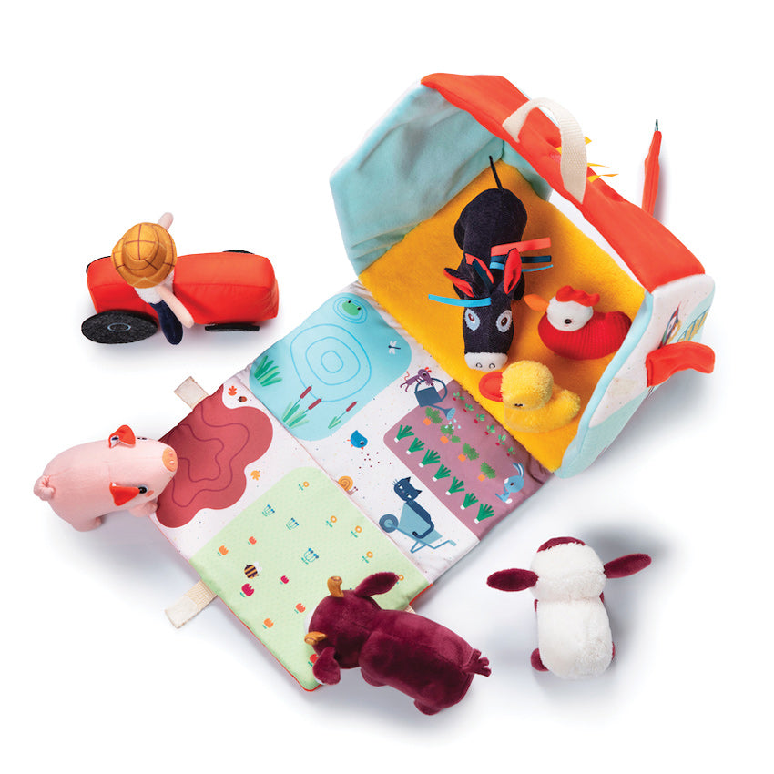 The Lilliputiens My First Farm is made from beautiful fabrics with individual textures and has a carry handle on top. It is comprised of a barn with an opening door and roof that becomes the farm yard enclosure. Farmer Fon is on his tractor and greets Ignace the donkey, Simon the pig, Rosalie the cow, Yvon the sheep, Paulette the chicken and Gaspard the duck who are the colourful inhabitants of this farm. This gorgeous set will help toddlers learn their animals and encourage role play at the same time, which is great for social development and imagination.