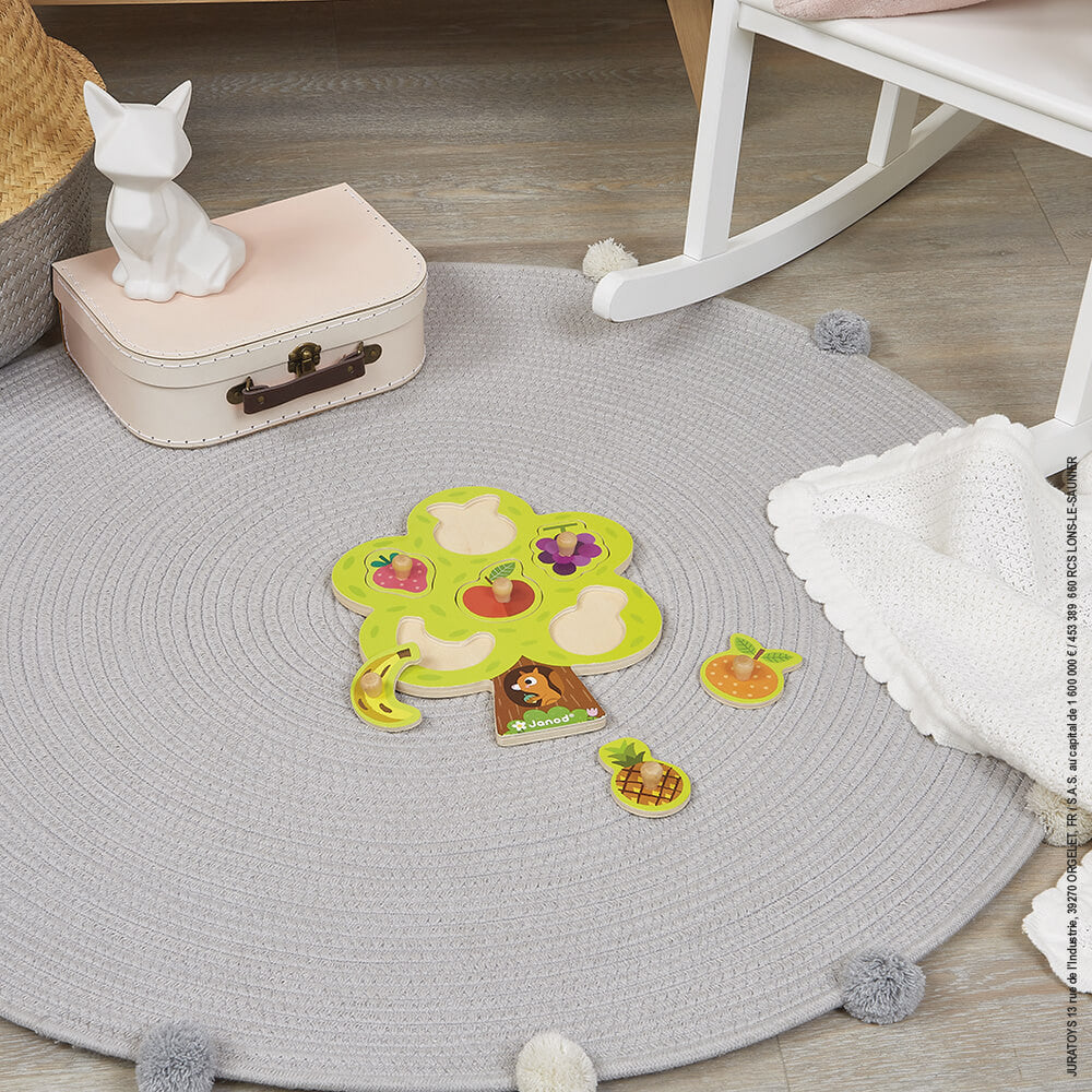 A cute little wooden peg puzzle from the Janod range, in a tree shape with 6 different fruit puzzle pieces. The peg handles make it easy for little fingers to grasp the puzzle pieces, and this puzzle is perfect for helping to develop vocabulary, logic skills and hand-eye coordination.