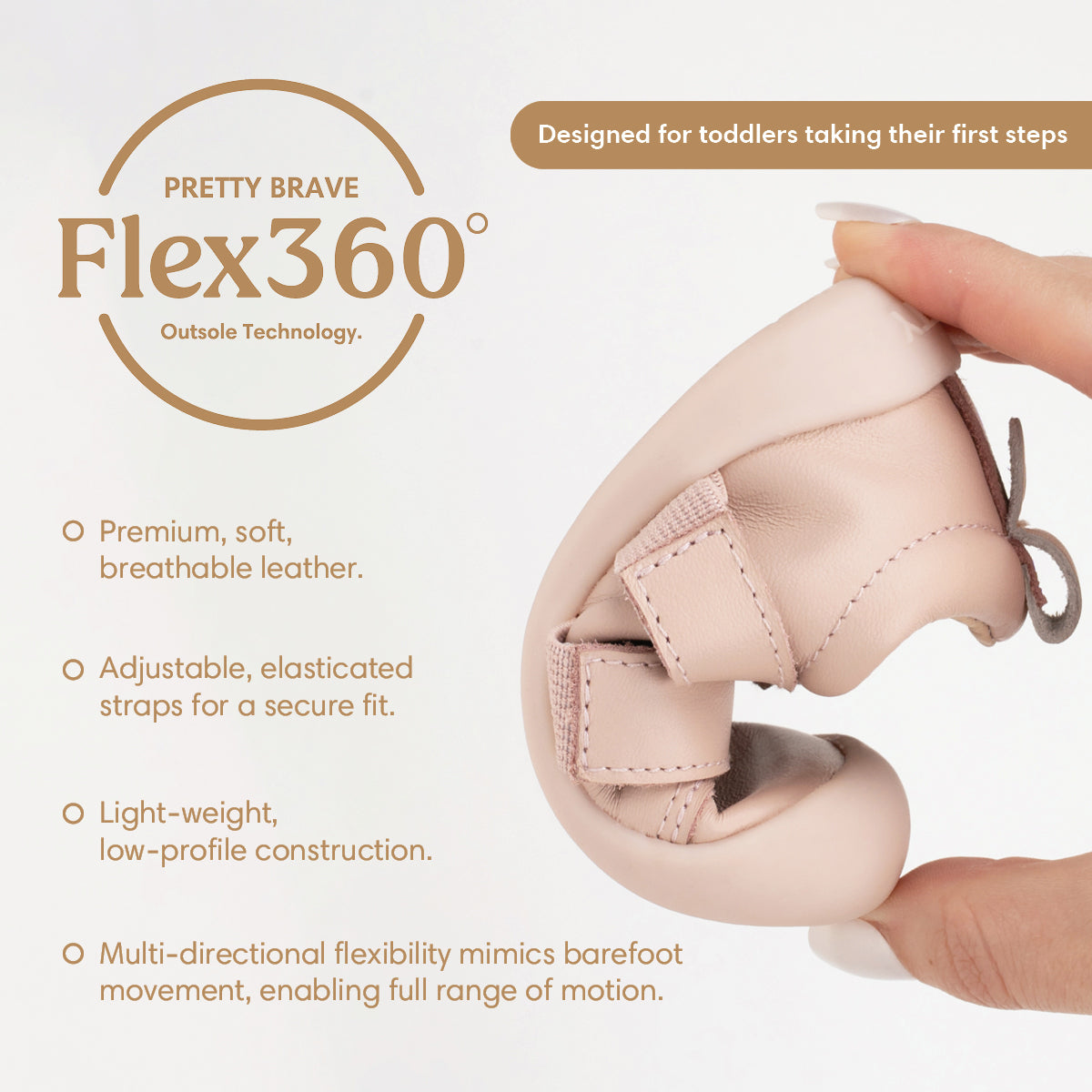 Designed to replicate the benefits of barefoot movement, the Toto toddler shoe by Pretty Brave supports little ones as they move from crawling to walking. Crafted from premium leathers, it features a lightweight, flexible design that moves naturally with growing feet. The custom Flex 360° outsole encourages natural movement and comfort, while padded ankle support and double hook-and-loop straps provide a secure, supportive fit - helping make the transition from crawler to walker that much easier.