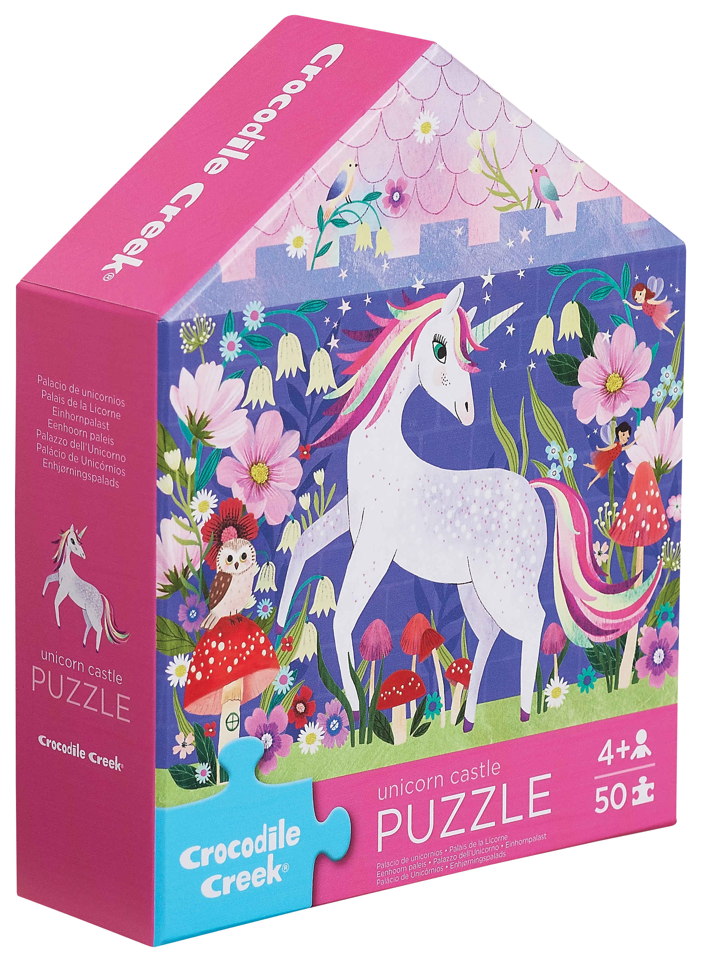 Enter a magical kingdom filled with unicorns, fairies and woodland creatures. This 50-piece Unicorn Castle puzzle in a house-shaped box from Crocodile Creek will delight any little dreamer enchanted by unicorns and fairy tales. Featuring bold colors and whimsical illustrations, this puzzle encourages hand-eye coordination and problem-solving. Great for interaction between a parent and child that can be used over and over. A sturdy house-shaped box makes for easy storage and its small size is perfect for travel.