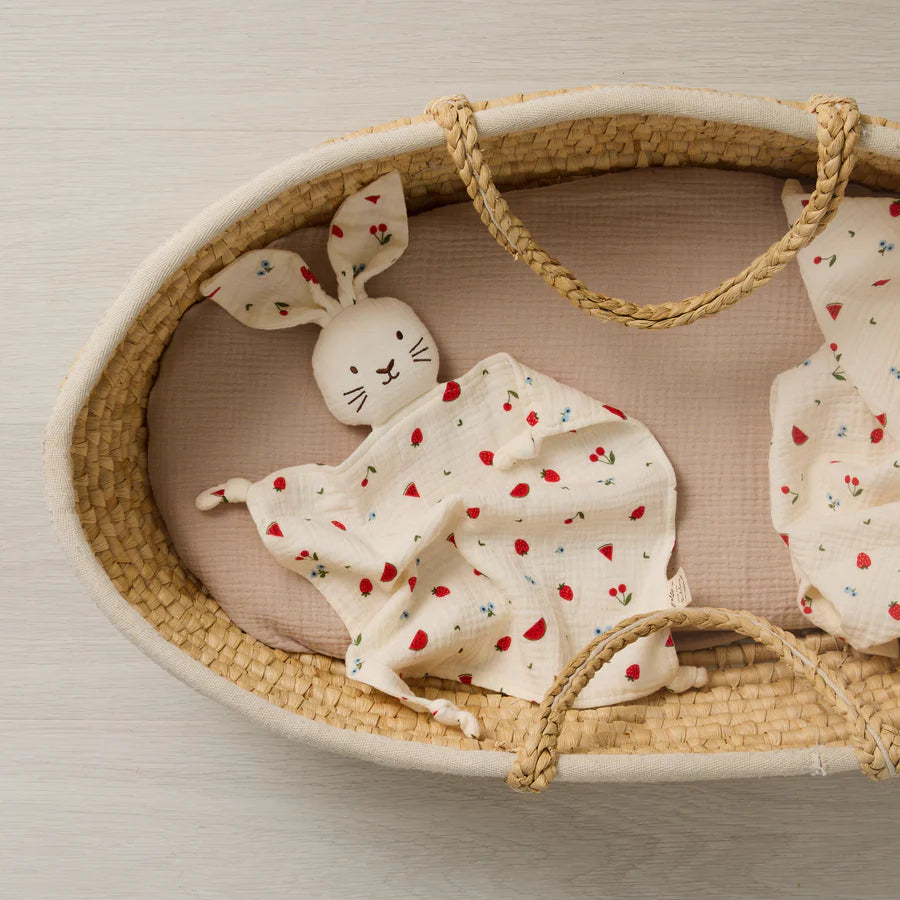 The sweetest bunny security blanket from the Over the Dandelions collection. Made from 4 layers of super soft GOTS certified organic muslin. With an embroidered face and soft floppy ears this little bunny comforter is destined to be loved! In the beautiful & summery "sweet pickings" print.