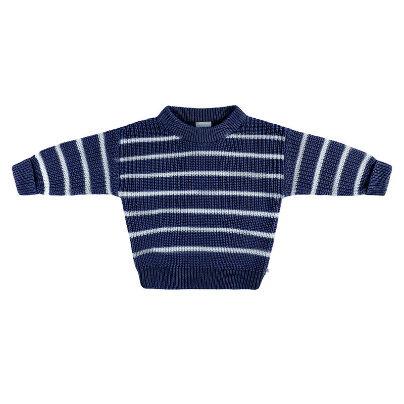 Gorgeous chunky rib knit jumper from KYND Baby, in navy stripe. Your little one will be super cute and cosy in this snuggly heirloom piece!