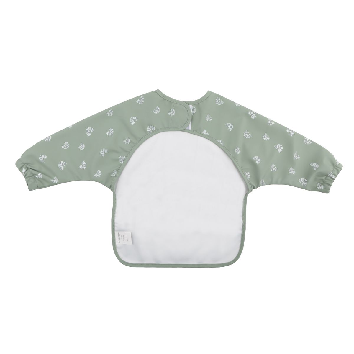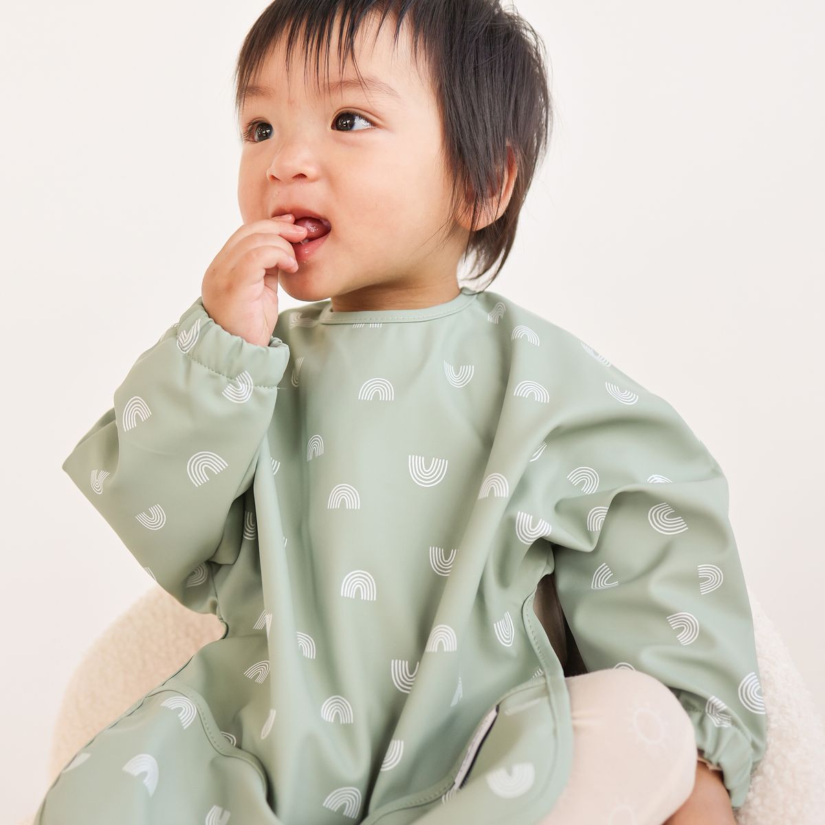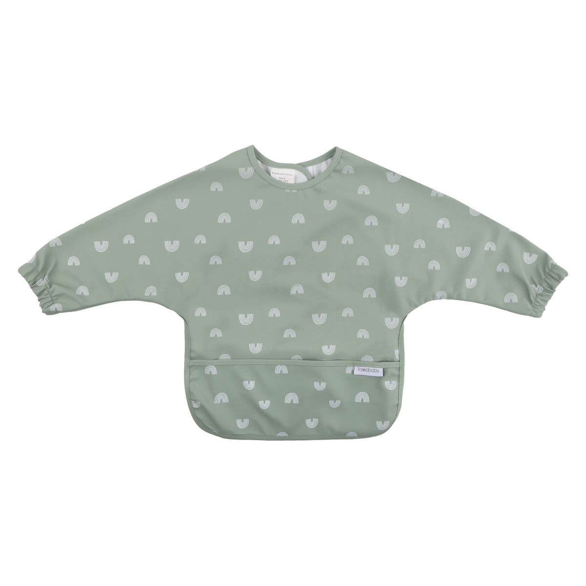 Cute and practical messy bib from KYND Baby, in sage rainbow print. This sleeved bib is the ultimate utility when it comes to playtime or food exploration! Super-soft, easy to clean, and instantly reusable after just one wipe!