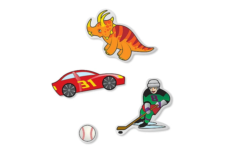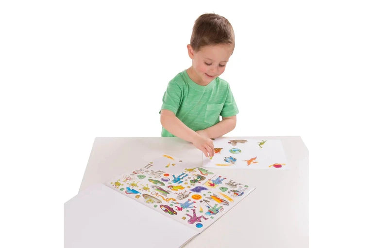 Melissa & Doug blue themed sticker book. Over 500 stickers are compiled in one giant sticker book. Each page is packed with stickers to illustrate favourite topics including dinosaurs, construction, outer space and many more. Create a picture or tell a story with these favorite themed stickers.