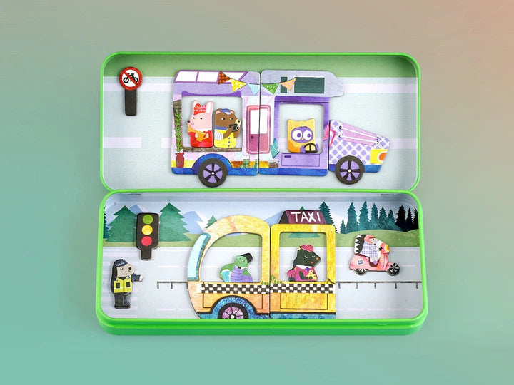 This magnetic travel set is car-themed, and includes two scenes and over 30 magnetic pieces. This gorgeous magnet set encourages imagination, concentration, and hand-eye coordination.
