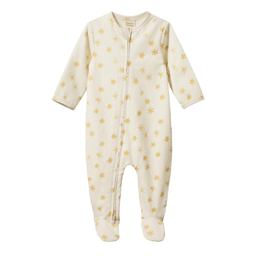 Long sleeve cotton footed romper from Nature Baby, in seasonal etoile print. Full length double ended zip opening for ease at change time.