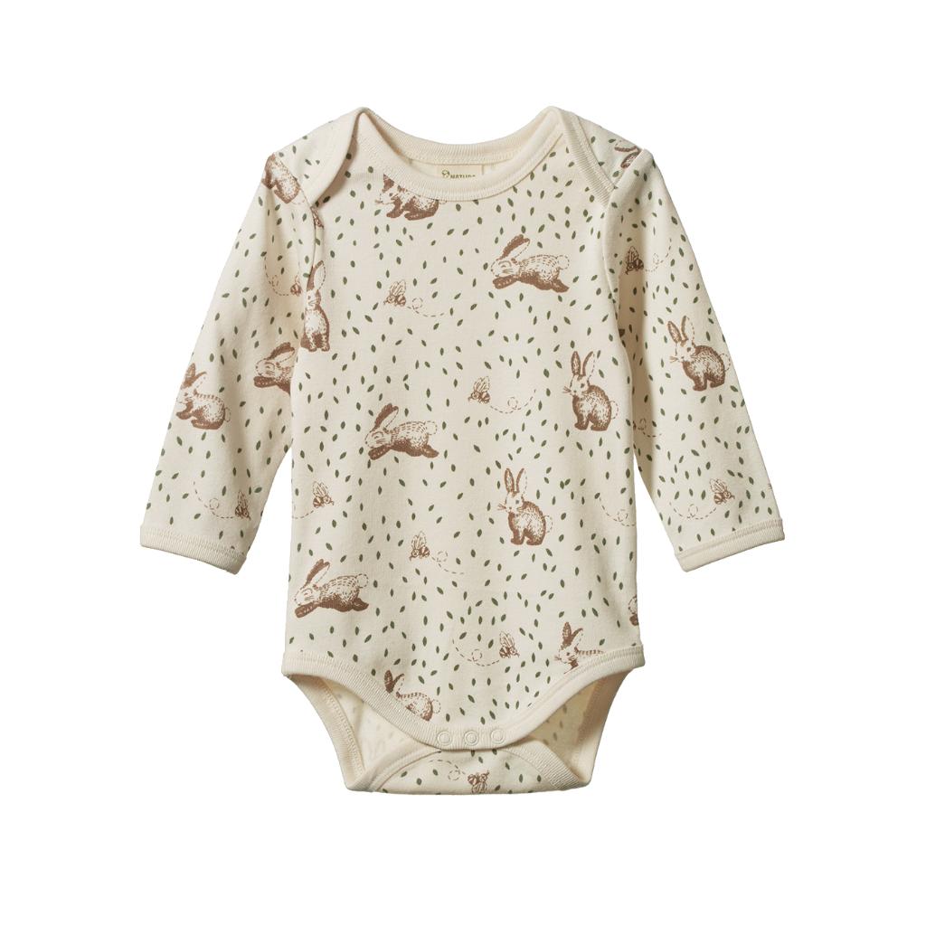 Long sleeve organic cotton bodysuit from Nature Baby in rabbitty print. So cute on it's own or great as a layering piece. Plunket style neckline for ease of getting over baby's head and domes at the crotch for nappy changing.