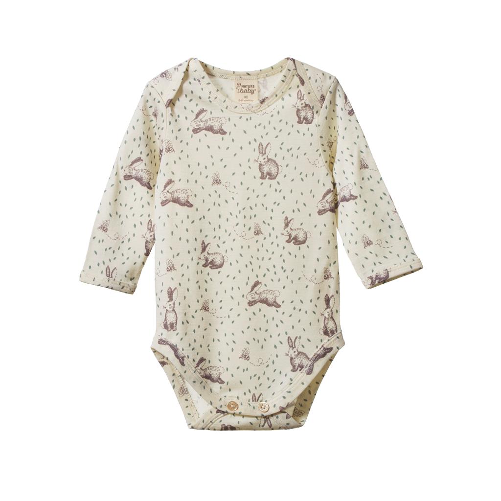 Long sleeve merino bodysuit from Nature baby, in rabbitty print.