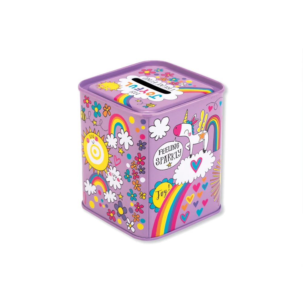 This colourful money tin for children has a slit in the top to put coins through and a removable tin base.