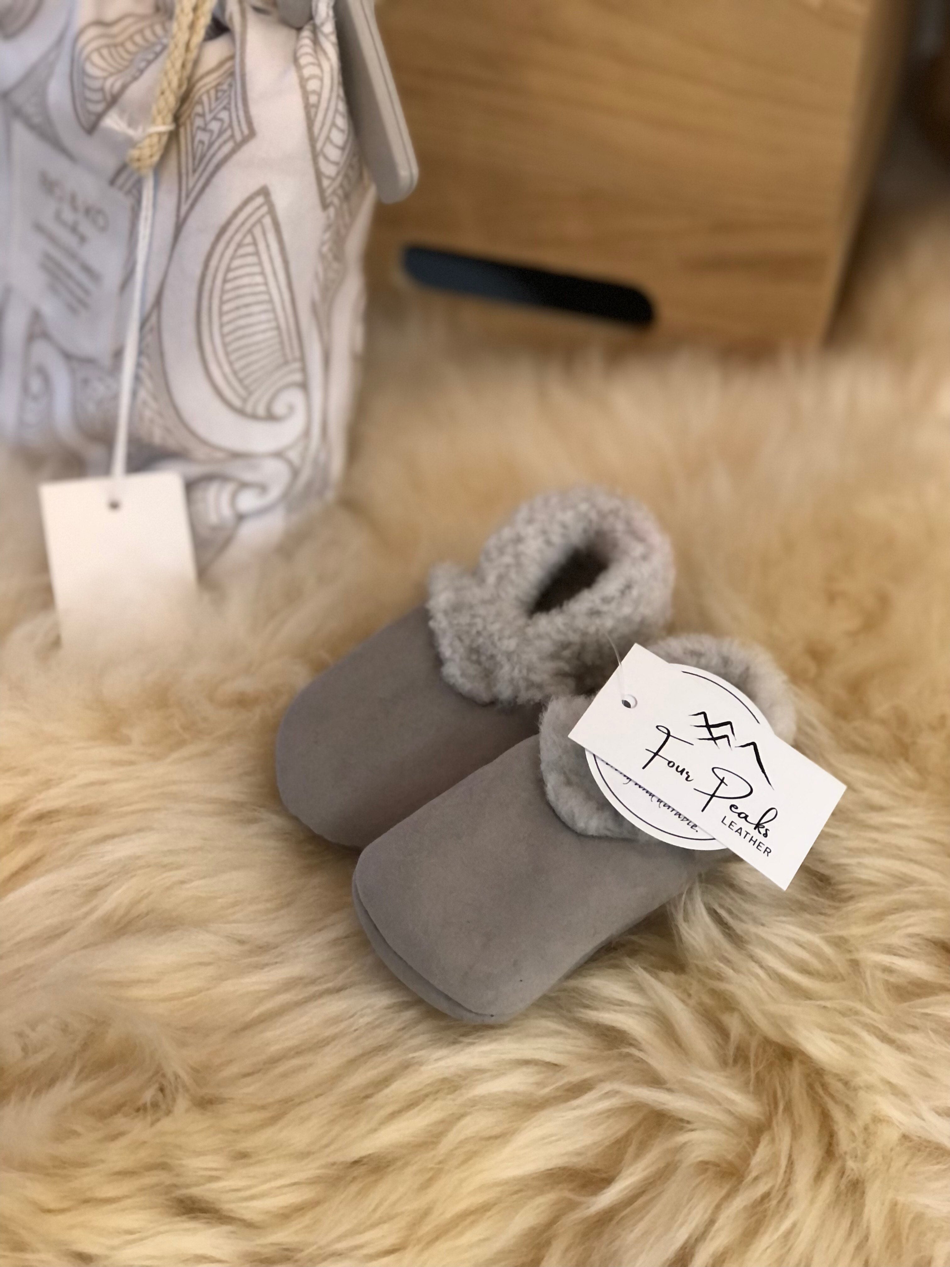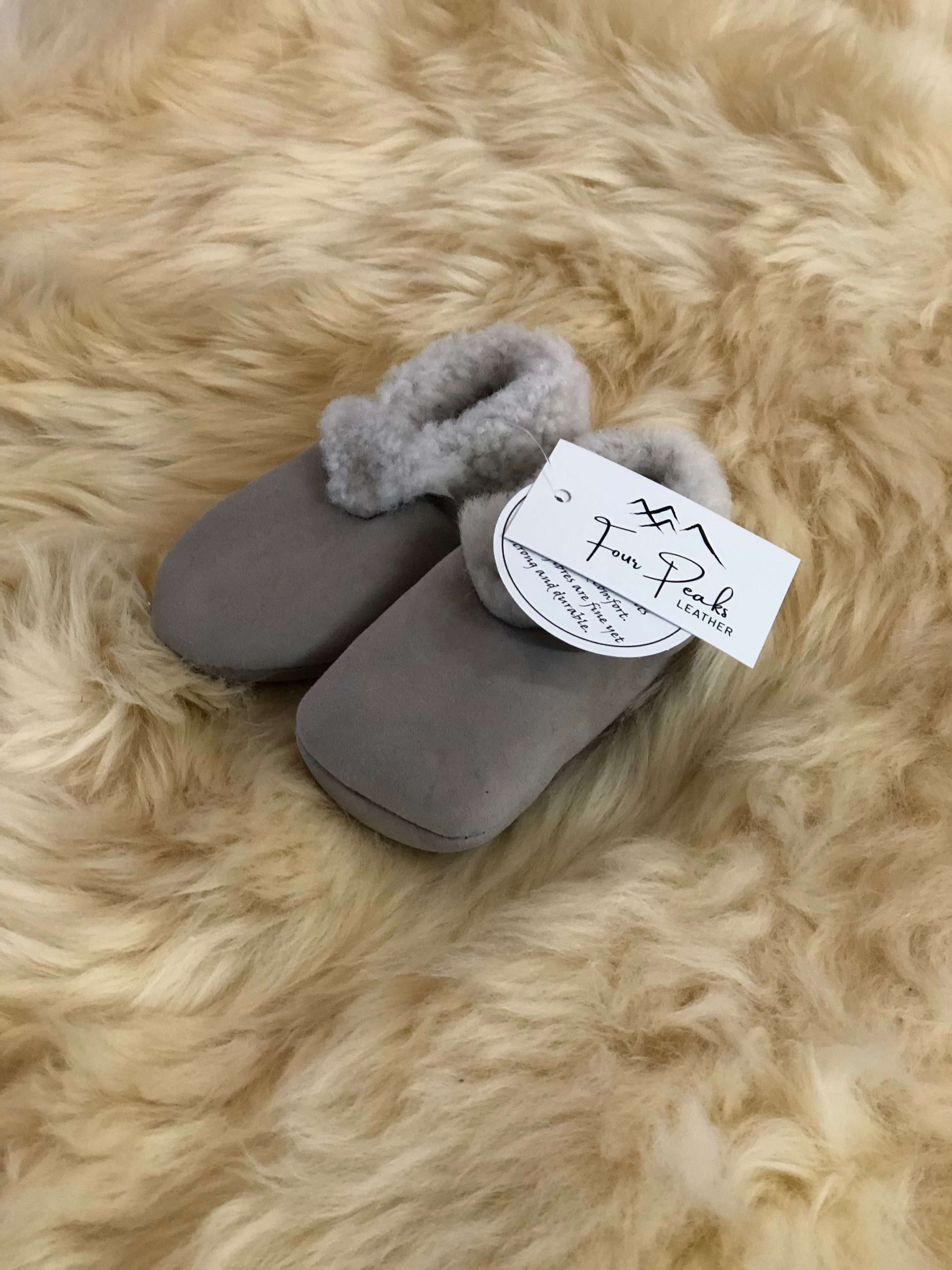 Lambskin booties from Four Peaks Leather. These make great baby slippers over the winter.  Fully wool lined they keep little feet snug on cold winter days. A popular baby shower gift.