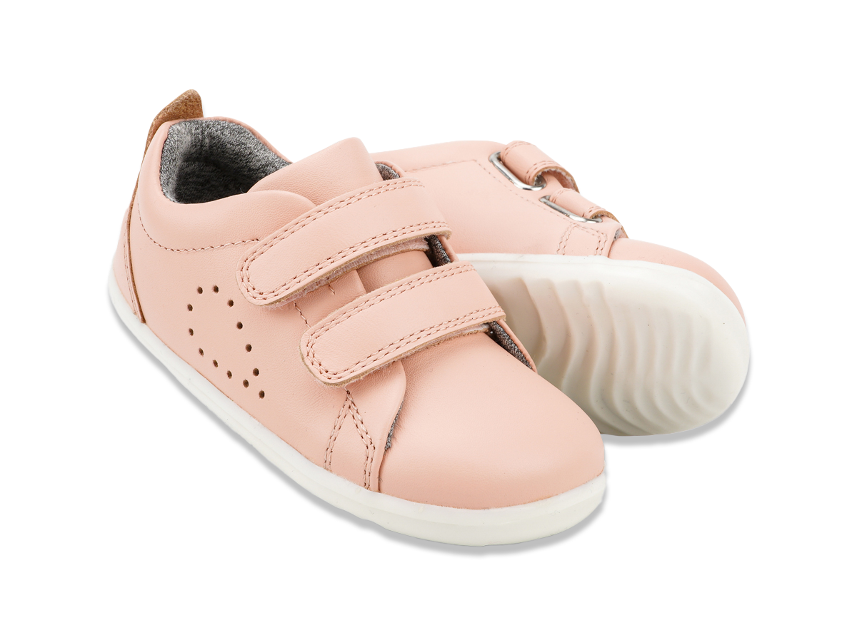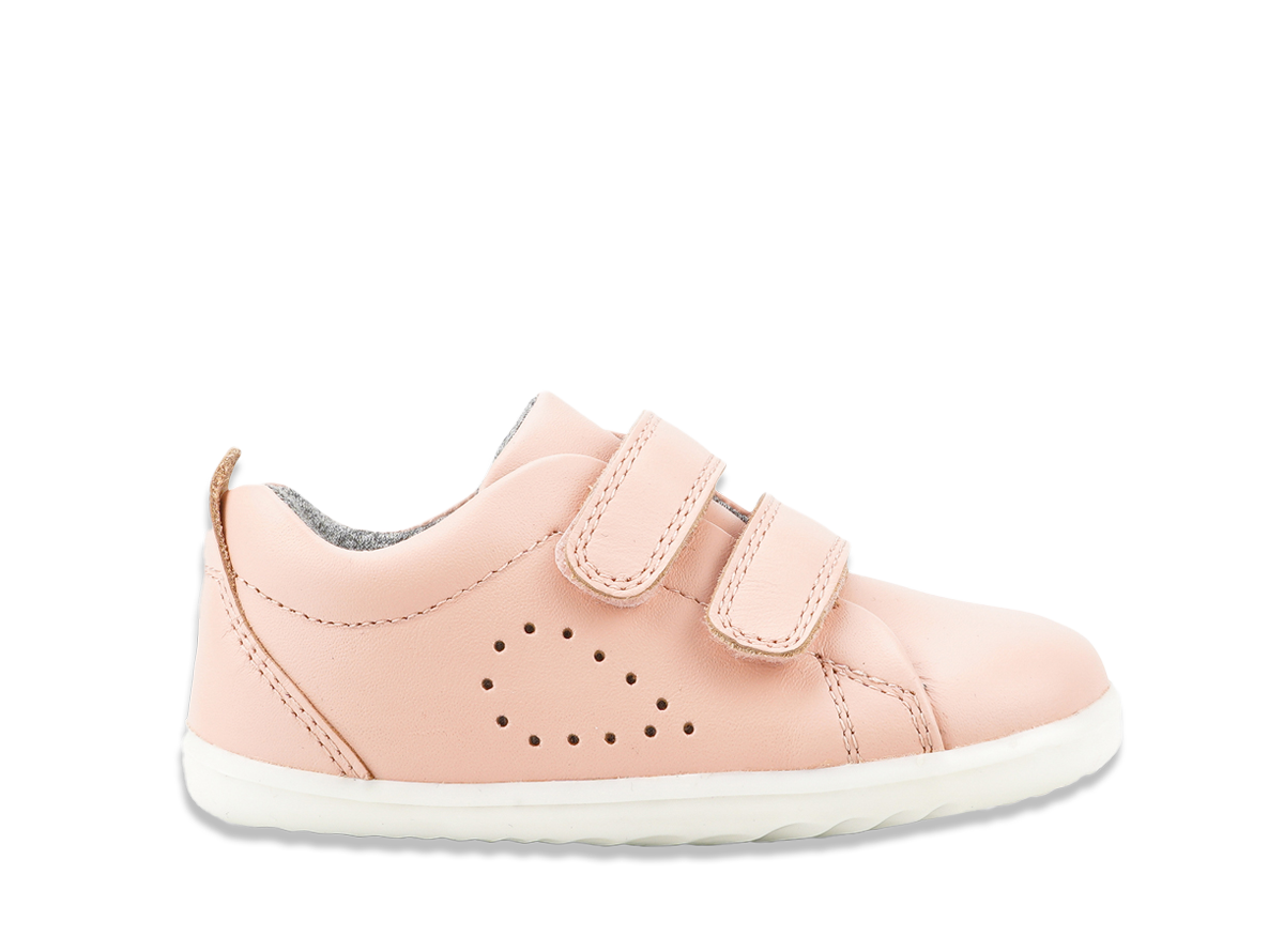 Leather sneaker style from Bobux Step Up range of shoes, the grass court sneaker features 2 velcro straps to fasten, so it's easy for little ones to get on & off themselves. Front opening so the sneaker opens up to easily fit different width feet and can then be fastened to fit individual foot shapes comfortably. In 100% leather upper for breathability. Padded collar at the ankle for extra comfort. Cotton knit lining. With a hardwearing TPR sole that provides durability and flex.