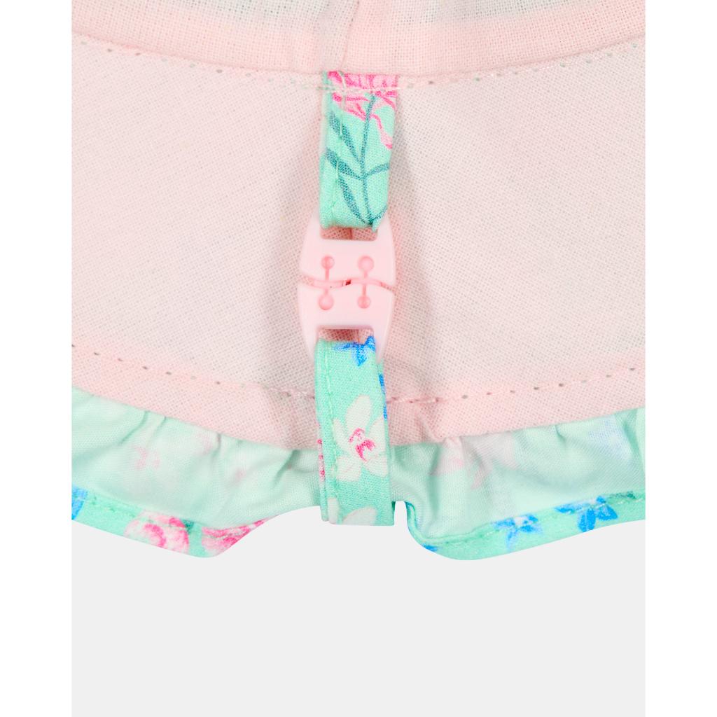 The Toshi Bell Matilda hat is crafted from the finest quality 100% cotton. The head tie with toggle offers adjustable sizing, and a chin tie with toggle secures the hat. The sunhat is fully lined for increased comfort. The security release clasp on the chin tie is designed to enhance wearer safety. Pretty styling is created with a softly frilled border. Toshi Bell Hat Matilda Acacia Mint features a delicate pink, blue and white floral pattern on a mint green base.