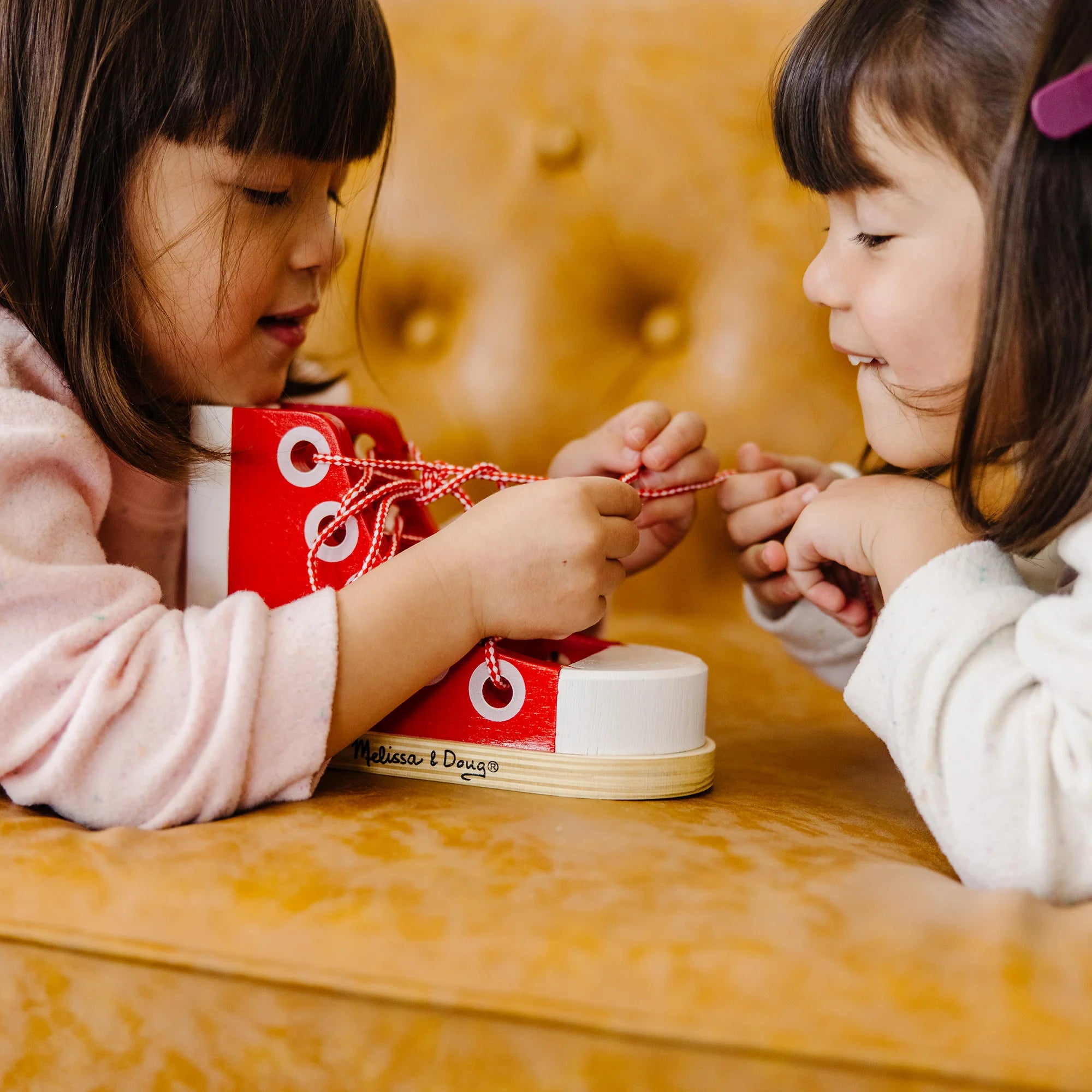 Over and under, then looping it through…look what I can do! Few things will give your child more satisfaction than mastering shoe lacing and basic tying skills. This brightly colored wooden high-top sneaker from Melissa & Doug will make practicing these skills enjoyable while helping your child reach this developmental milestone.