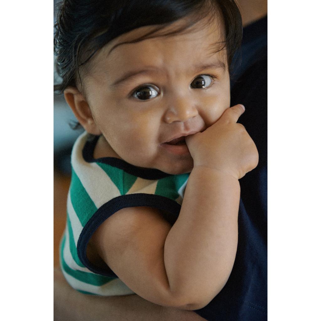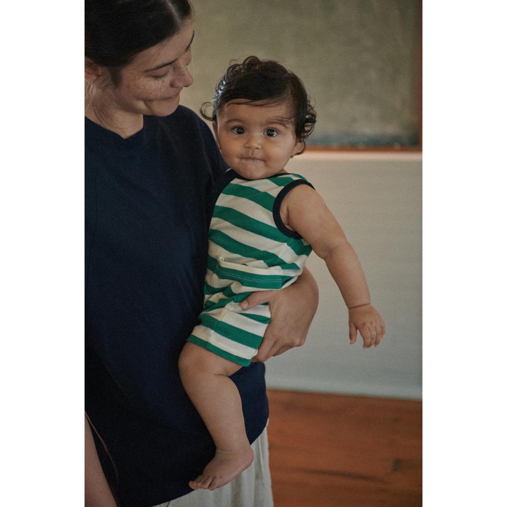 Sleeveless cotton romper from Nature Baby, in peppermint and natural stripe with navy trim. Henley style front button placket and domes at the crotch. 100% organic cotton.
