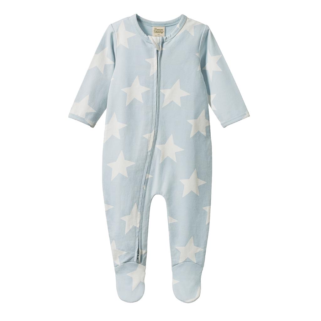 Long sleeve cotton footed romper from Nature Baby. In the seasonal magic blue print.  Full length double-ended front zip opening for ease at change time.