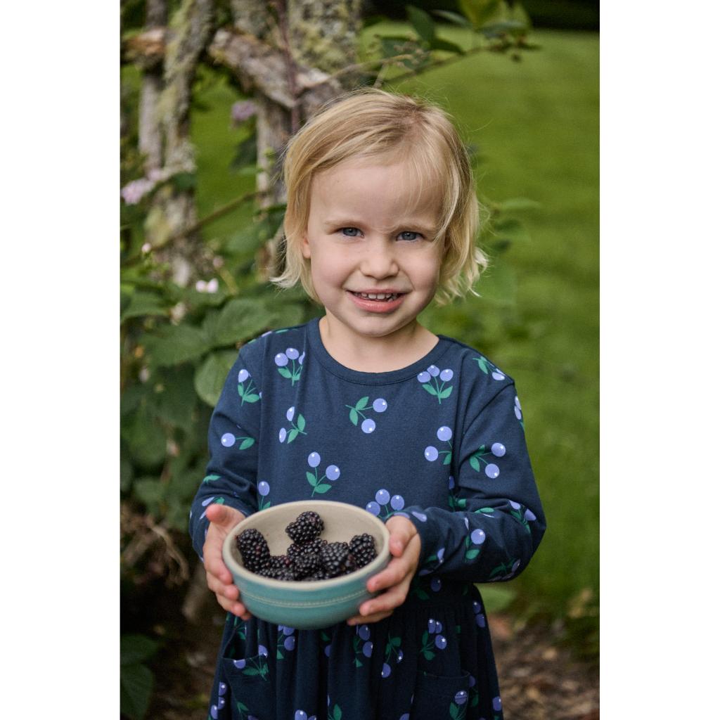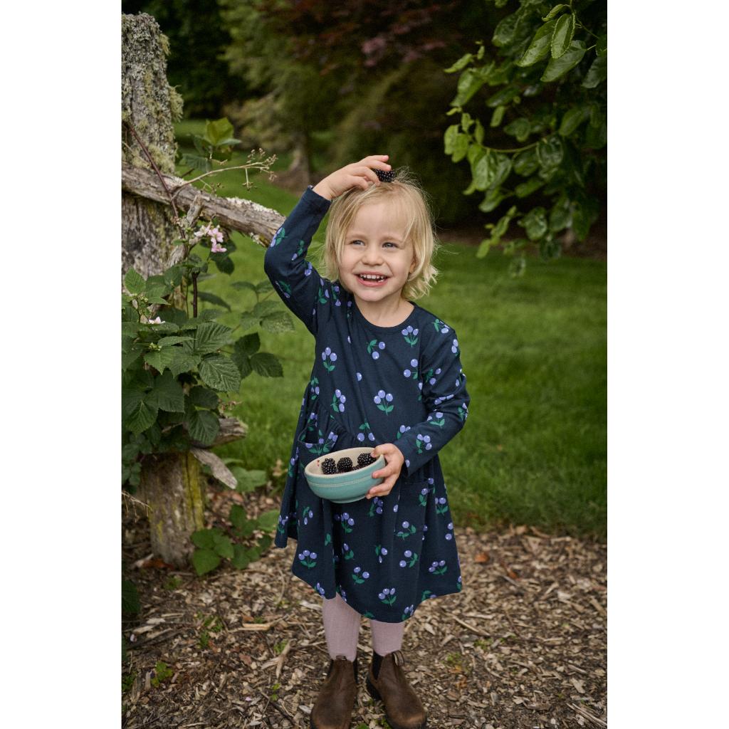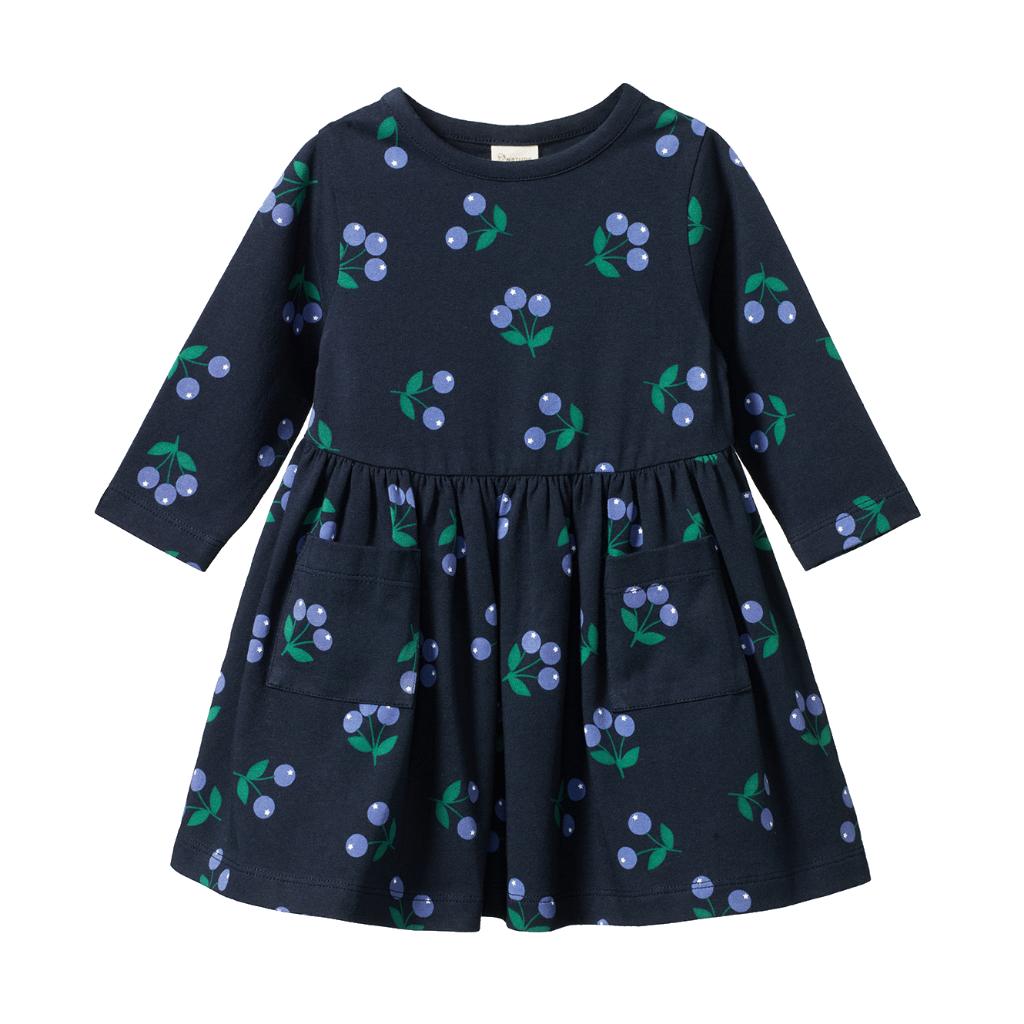 The sweetest little long sleeved dress from Nature Baby, in the seasonal winter berry navy print. A classic long sleeve t-shirt style dress with a gathered hem skirt, a great classic piece for your little one. Made with organic cotton stretch jersey, it is light, breathable and comfortable and can be layered or worn on its own. Features two snap dome closures at the back neck for easy dressing.
