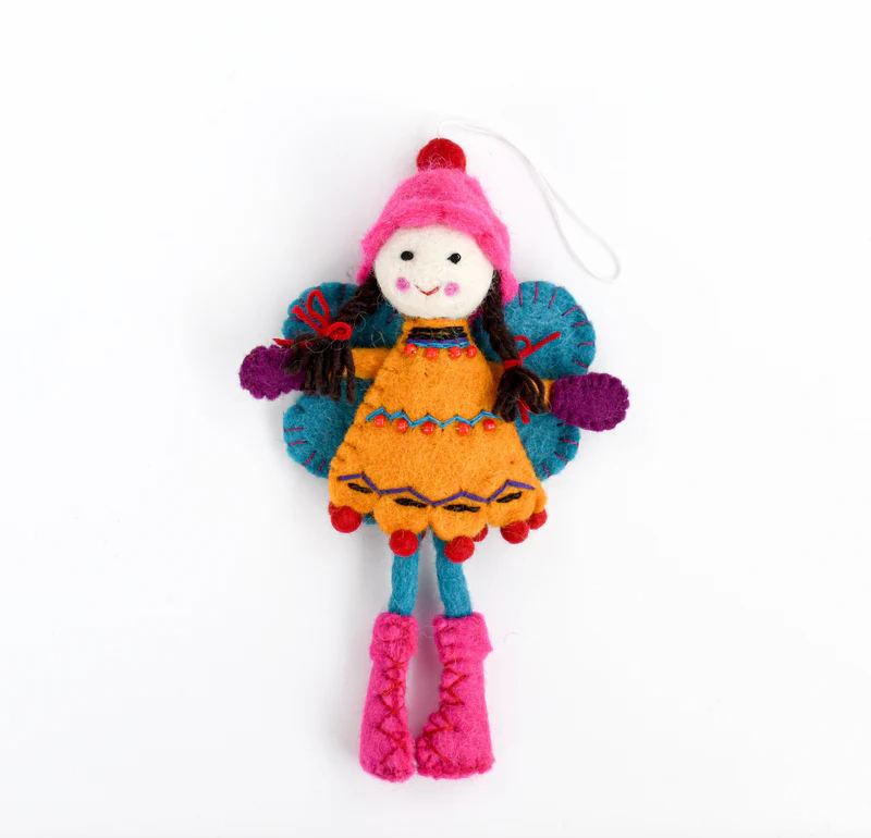 This beautiful hanging fairy from Tara Treasures has a pretty yellow dress, complemented by a pink hat & boots, blue wings and stockings, and purple gloves. She also features beading and embroidery on her dress. Great for fairy-themed pretend play, or add her to your Christmas tree for a touch of whimsy.