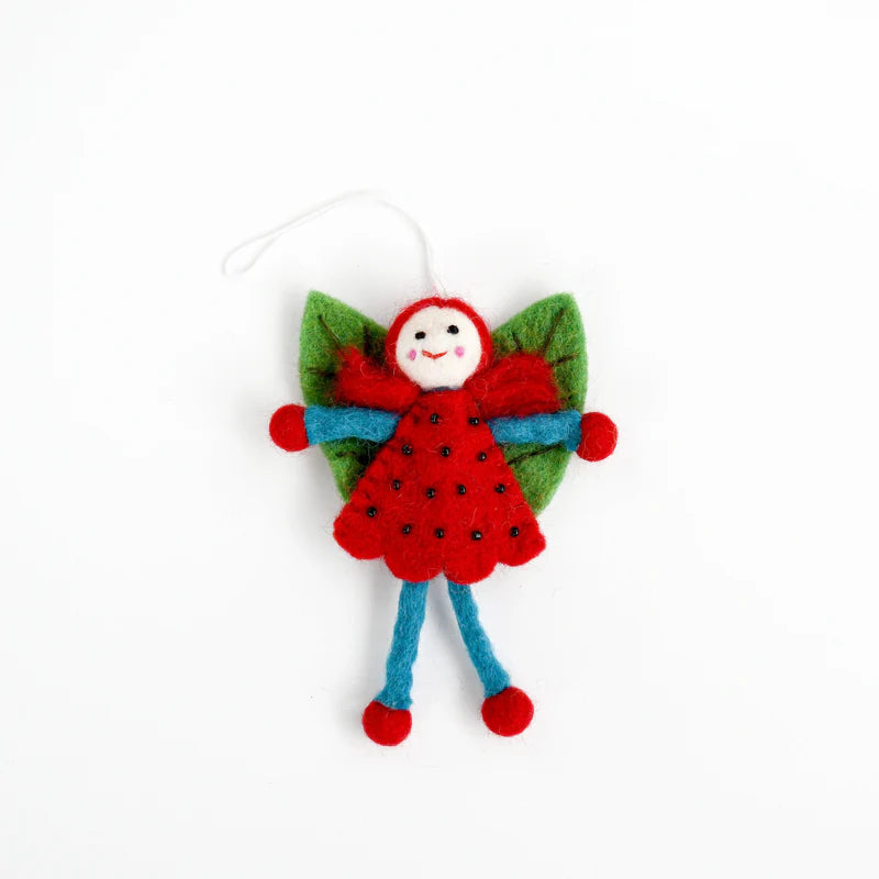 This beautiful hanging leaf fairy from Tara Treasures has a sweet red dress with beading detail, red hair and leafy green wings. Great for fairy-themed pretend play, or add her to your Christmas tree for a touch of whimsy.